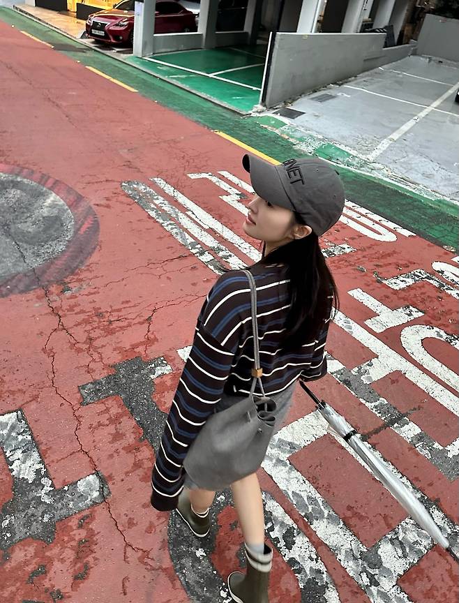 여기에 톤다운된 그레이 계열 캡과 부츠백을 더해 전체 룩을 자연스럽게 이어줬어요.