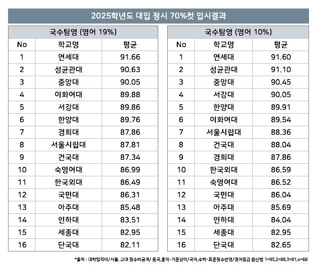 2025학년도 대입 정시 70%컷 입시결과