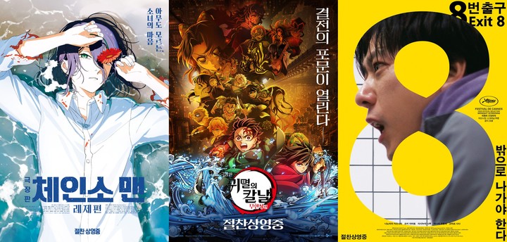 [EPN엔피나우 고나리 기자] 10월 26일 기준, 극장 예매 순위 상위권이 일본 애니메이션과 영화로 빠르게 채워지고 있다. ‘극장판 체인소 맨: 레제편’, ‘8번 출구’, 그리고 ‘극장판 귀멸의 칼날: 무한성 편’이 최상위권에 포진하며 국내 극장가에 뚜렷한 일본 작품 선호 경향이 드러났다.