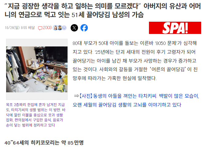 "지금 와서 힘들게 일할 의미를 모르겠다" 아버지 유산과 어머니 연금으로 버티는 51세 은둔형 외톨이 남성의 속마음" 히키코모리(은둔형 외토리) 노령화 증가세 40~65세 히키코모리가 거의 100만에 육박 이들은 부모나이 70~90세 연금에 의존하며 생활. 8050 문제라는 사회문제로 떠오르는 중 여자의 생물학적 우월성곧 떠날 거 같은 지하철 타는 꿀팁고래의 귀지에서 밝혀진 사실들1년 내내 매출 떡락중인 아웃도어 브랜드배우 이순재 건강 악화 근황