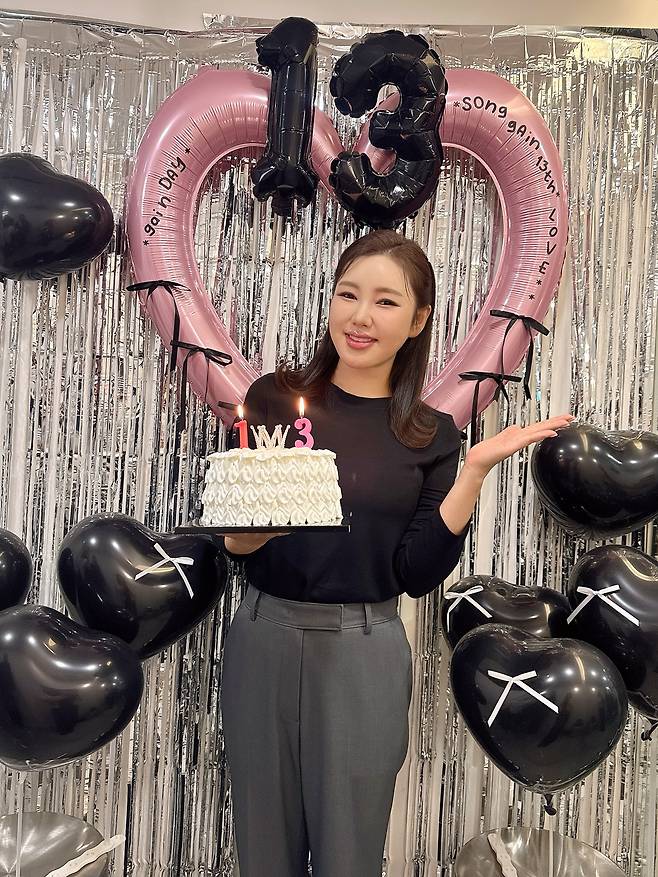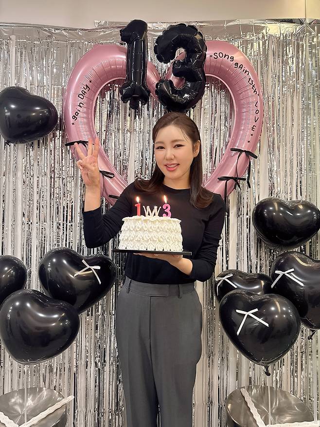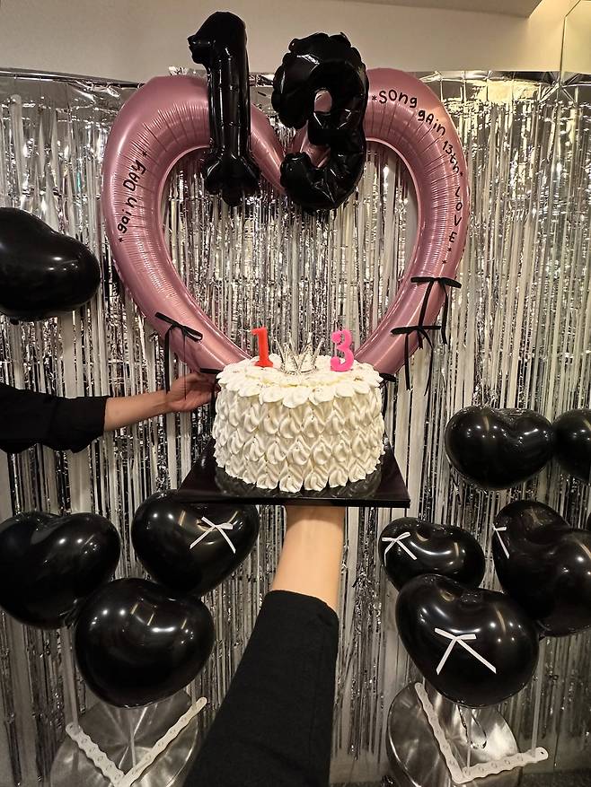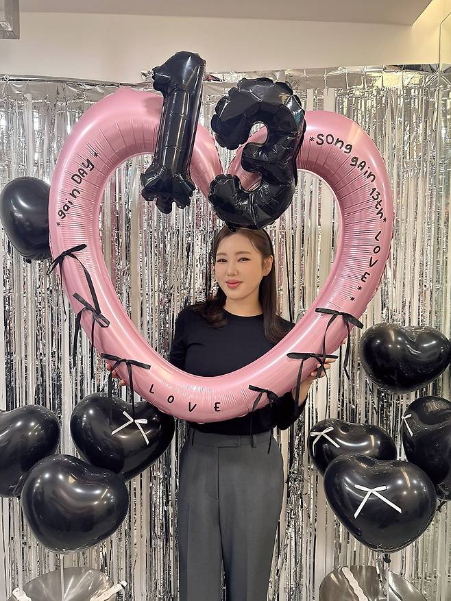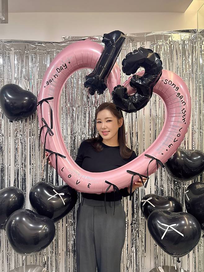 특히 핑크 하트 풍선과 블랙 포인트의 대비가 송가인의 우아한 이미지를 더 돋보이게 했어요.
