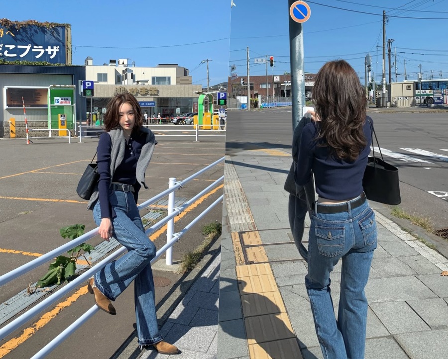 이어 공개된 또 다른 사진에서는 네이비 톱과 부츠컷 데님 팬츠, 브라운 슈즈로 클래식한 감성을 더한 스트릿룩을 완성했다. 회색 니트를 어깨에 걸치고 자연스럽게 털어낸 웨이브 헤어로 도시적인 세련미를 뽐냈다.