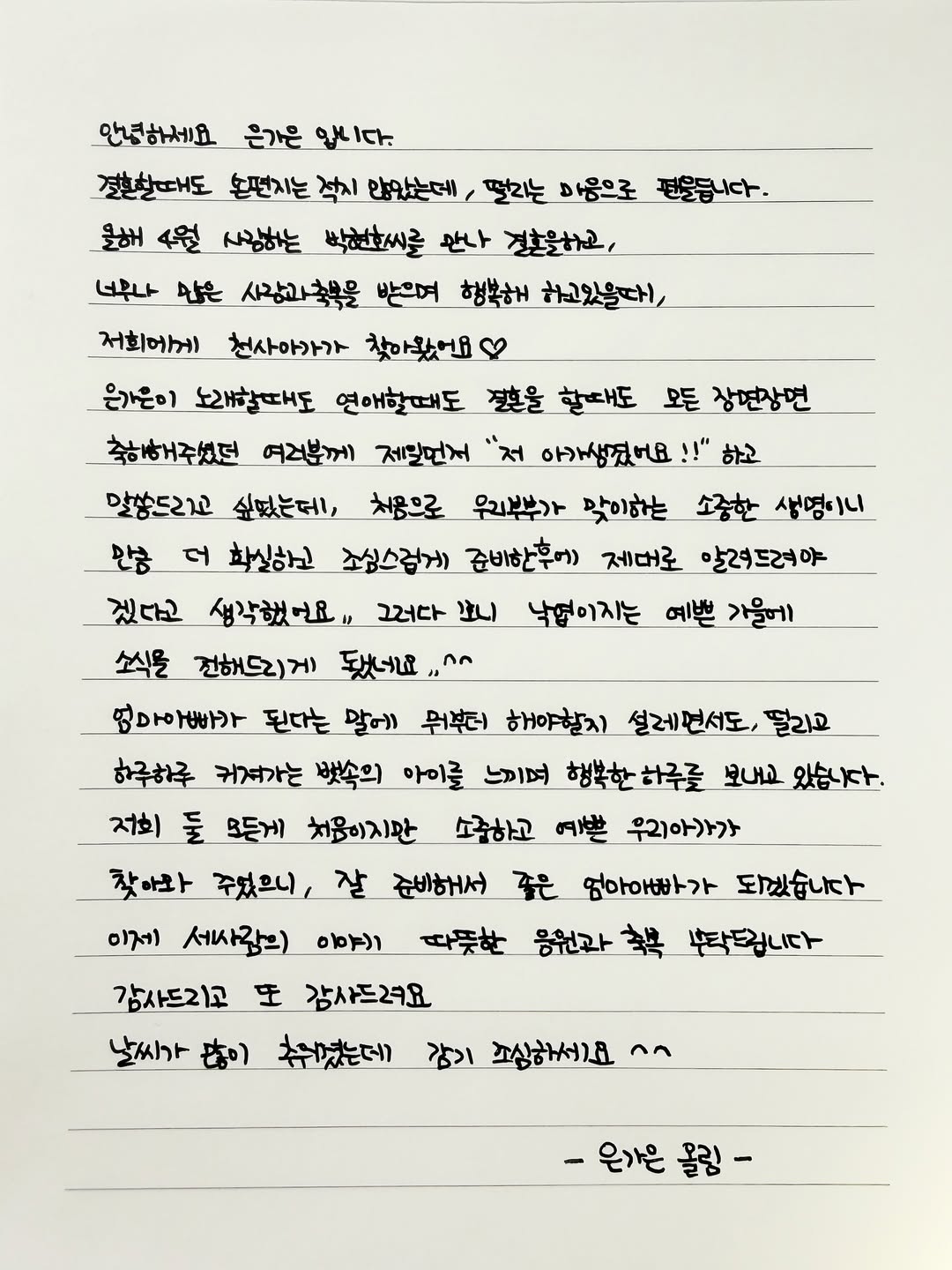28일 은가은은 자신의 인스타그램에 "결혼할 때도 손 편지는 적지 않았는데 떨리는 마음으로 펜을 듭니다"라는 글로 시작하는 손편지를 공개했다.