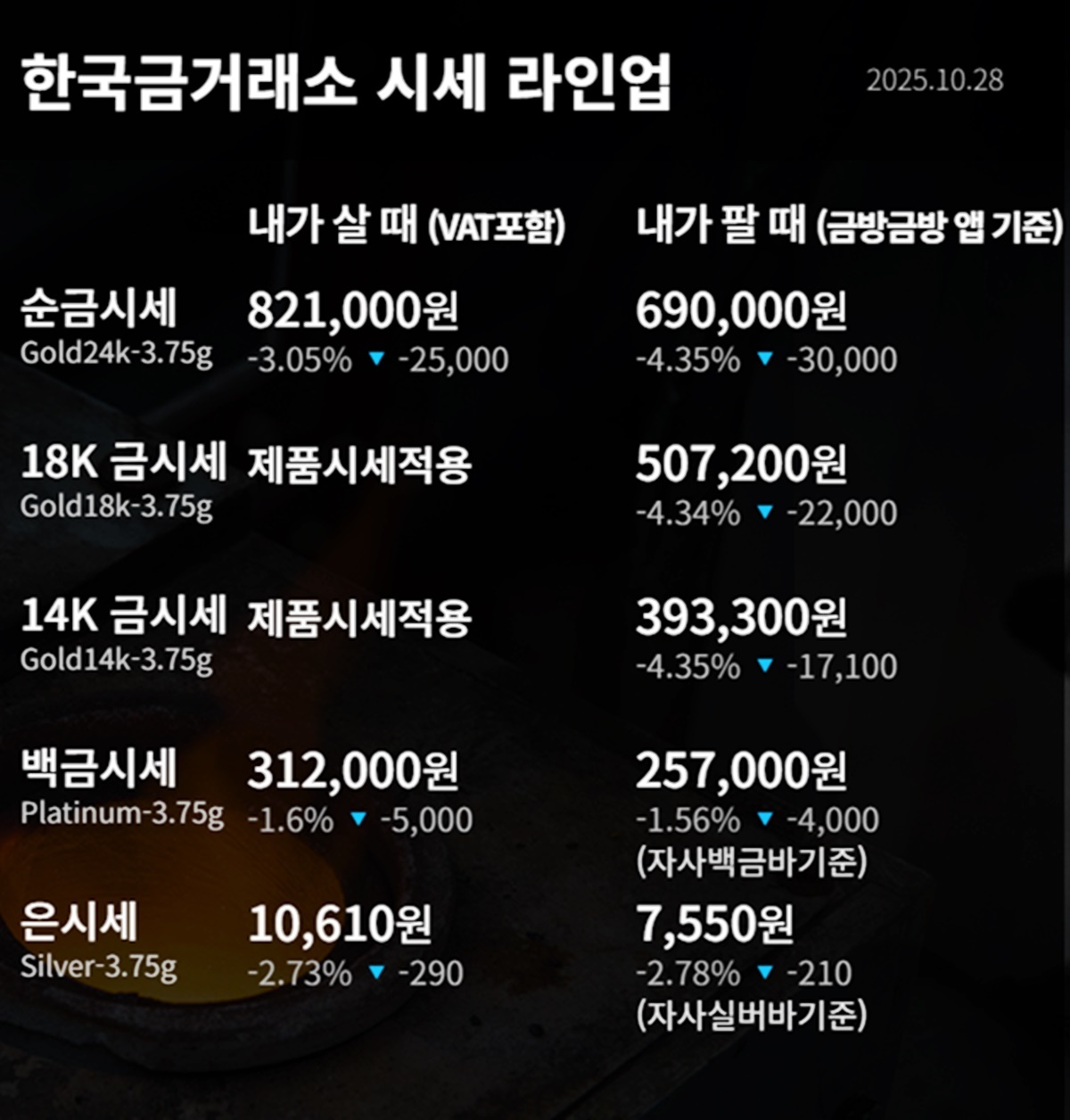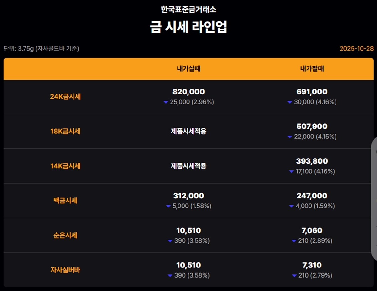 대한민국 자본시장을 종합적으로 관장하는 한국거래소 기준 이날 오후 금가격은 다음과 같다.