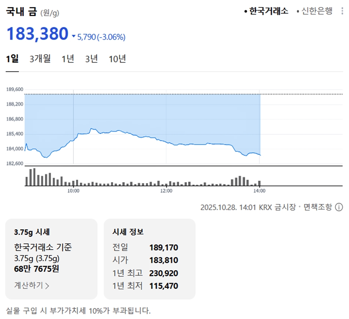 국내 금시세(금값)가 28일(한국 시각) 오후 하락세(전 거래일 대비)를 보이고 있다.