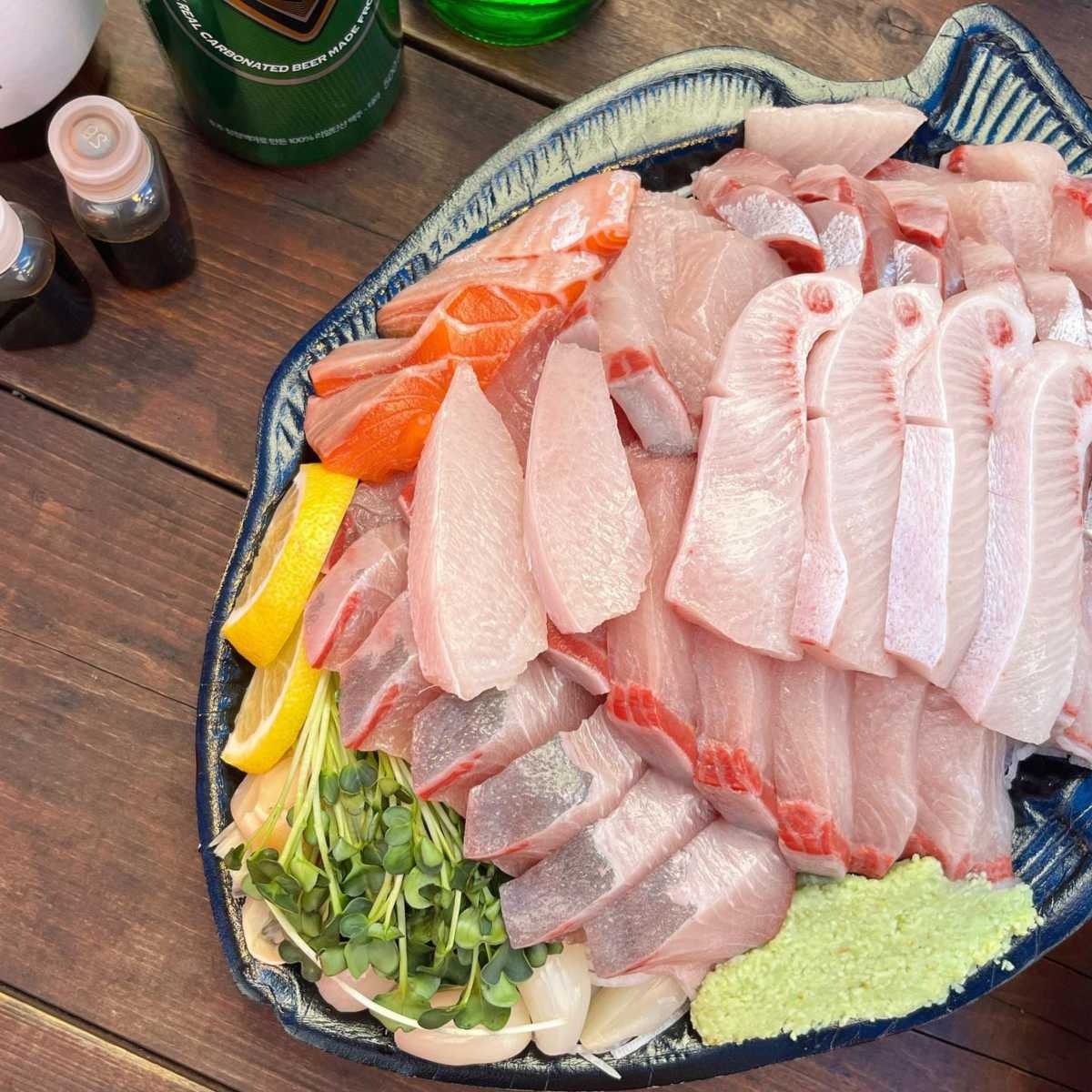 숙성 생참치회 56,000원 활 모듬회 정석 65,000원