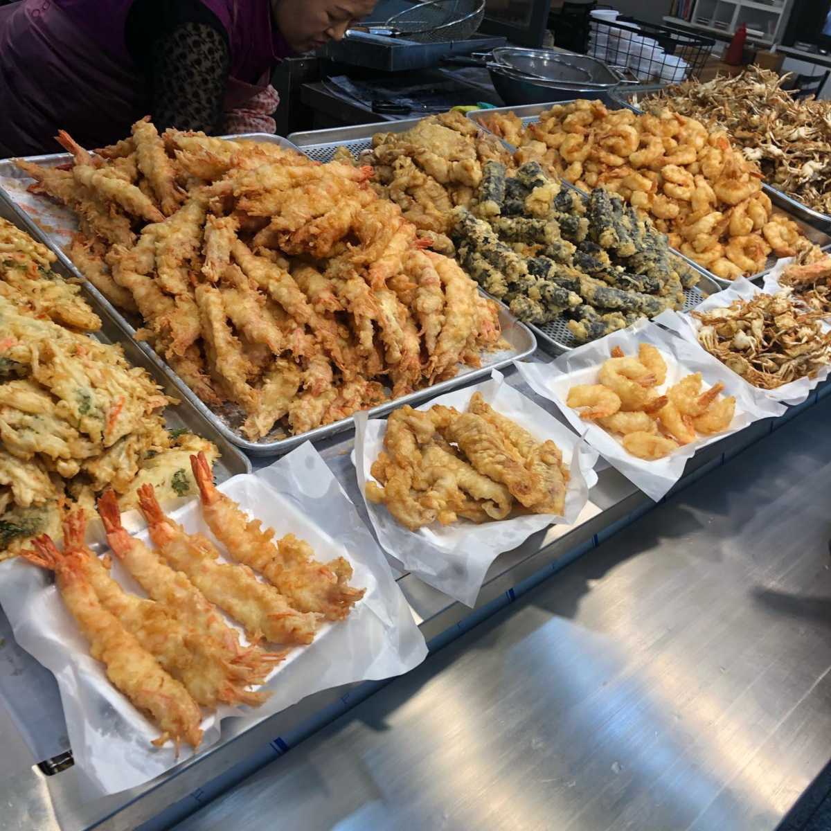 큼지막한 크기의 튀김 잘하는 집 ‘삼정튀김집’. 다른 튀김집에서 보기 힘든 아나고 튀김과 커다란 왕새우 튀김을 즐길 수 있는 튀김집이다. 튀김의 종류도 야채, 고구마, 왕새우, 오징어, 고추, 김말이, 알새우, 아나고, 미니 크랩으로 다양하고 한번 튀겨놓은 튀김을 주문과 동시에 한 번 더 튀겨주기 때문에 바삭한 식감을 느낄 수 있다. 이 집은 수산시장인 만큼 해산물 튀김이 유명한데 실하고 신선한 원재료를 큼지막하게 넣어 튀겨 깔끔하고 바삭하면서 속이 알찬 튀김을 맛볼 수 있다.