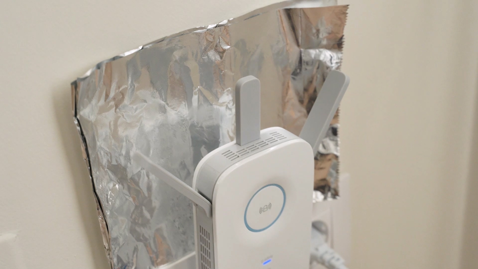 이때 준비해 놓은 알루미늄 호일을 와이파이 공유기 뒤에 두세요. 그러면 알루미늄 호일이 여기저기로 흩어지는 와이파이 신호를 모아 한곳으로 보내 더욱 강력한 신호를 받을 수 있답니다.