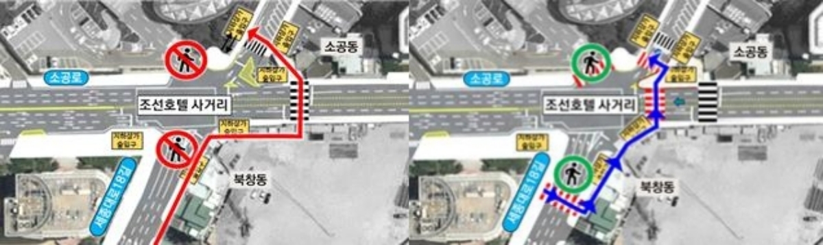 가장 큰 변화는 조선호텔 사거리 일대의 보행 연결성 강화다. 현재 사거리에 북창동과 소공동을 잇는 횡단보도 1개소만 있었지만, 조선호텔 앞과 세종대로18길 방향에 횡단보도 2개소가 새로 생긴다. 기존 횡단보도도 교차로에 더 가깝게 옮겨 보행자의 이동 동선을 단축한다.