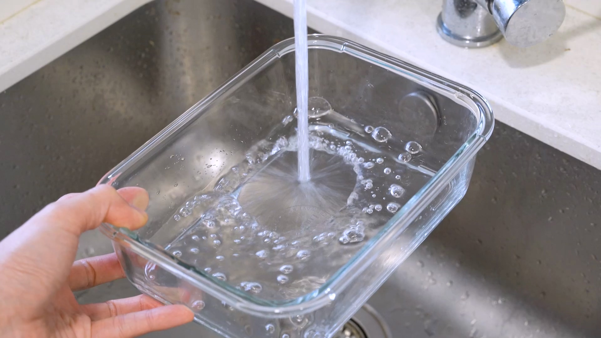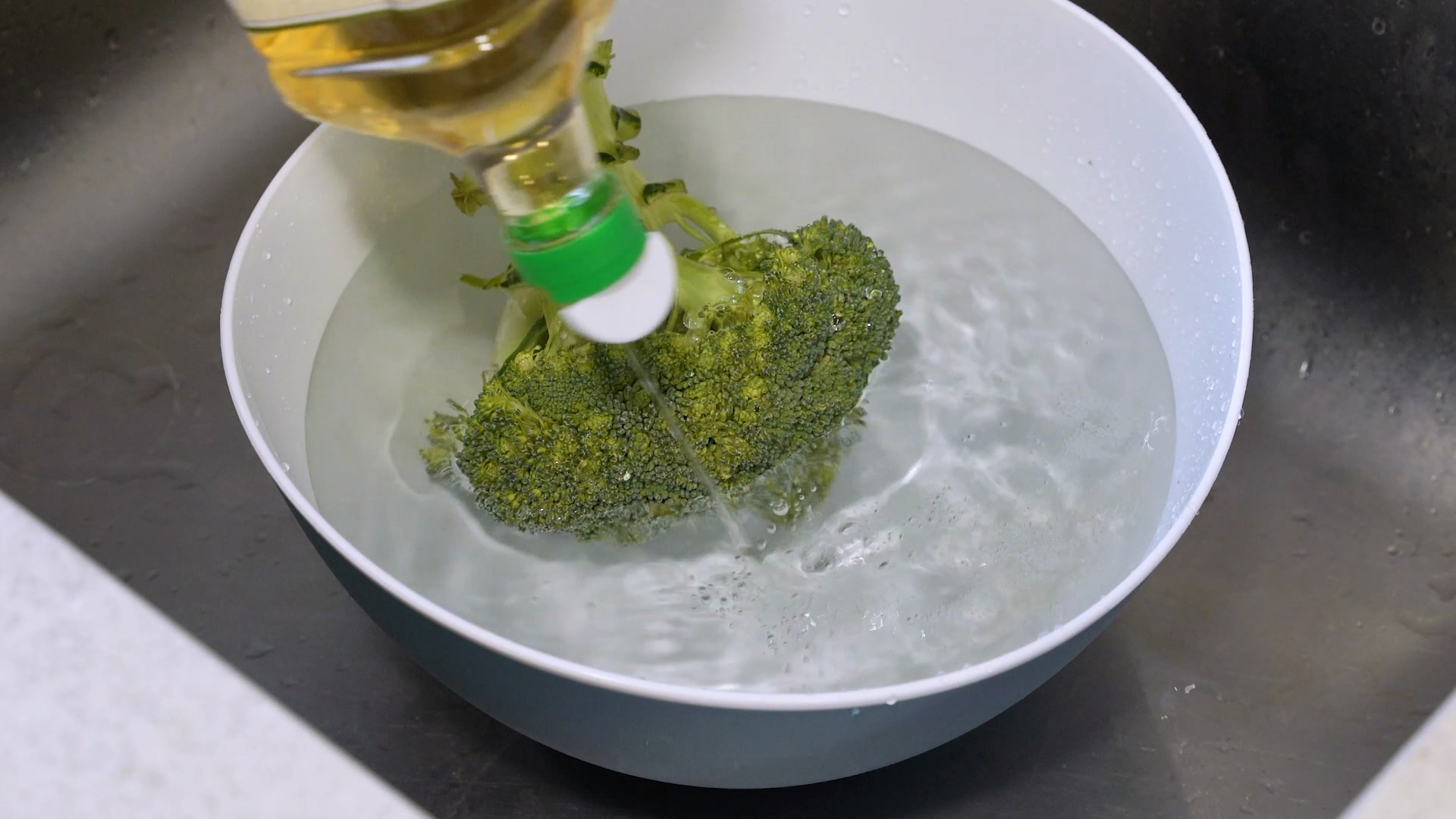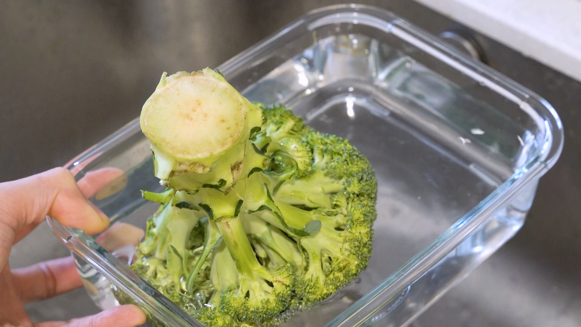 꽃봉오리를 열기 위해 먼저 브로콜리가 잠길 수 있는 깊이의 통 하나를 준비하세요. 그리고 물을 충분히 받아 줍니다.