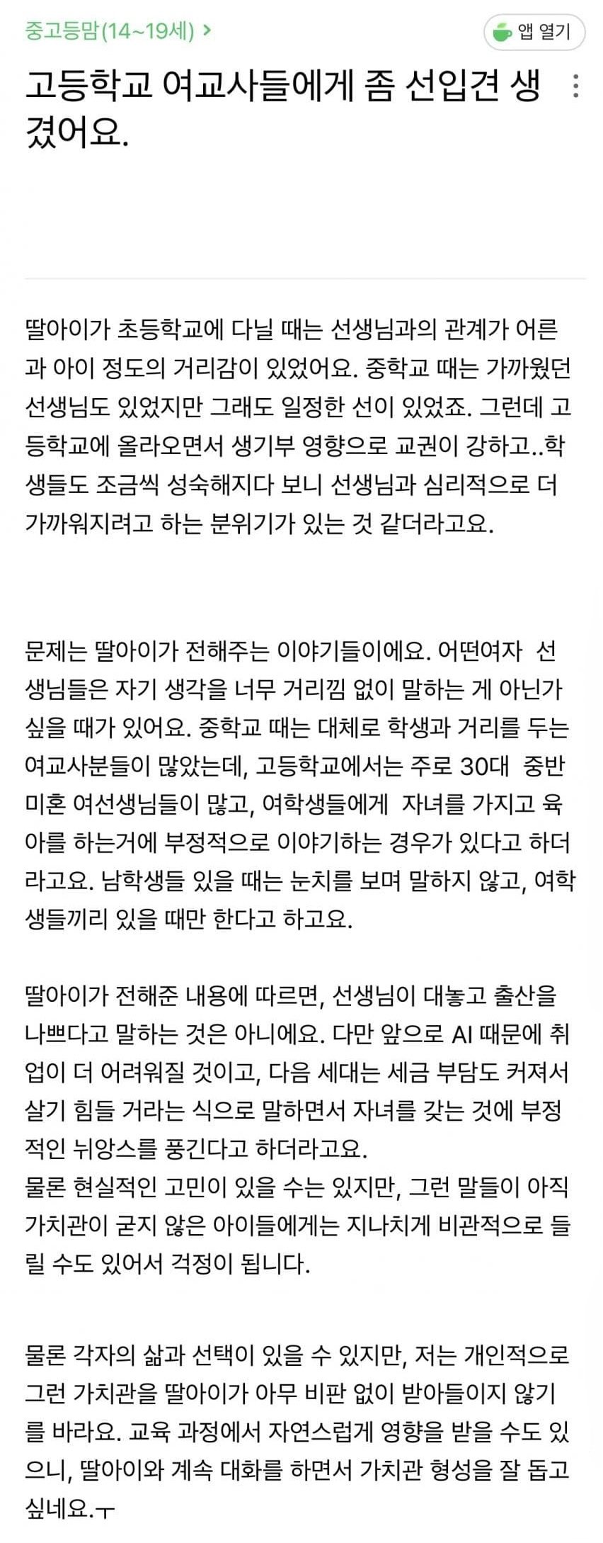 - 고등학교는 30대 중반 미혼 여교사가 많음 - 걔네가 학생들한테 출산과 육아를 부정적으로 묘사함 - 심지어 남학생들 앞에선 입 닫고 있다가 여학생들끼리 있을 때만 얘기함ㅋㅋㅋㅋ 영어로 말하는게 어렵다고 생각하는 이유최진실 딸 최준희 몸매 근황지금 일본에서 의미부여하고 난리난 사진 2장싱글벙글 불교 다문화 근황6년째 개봉 안하는 한국영화