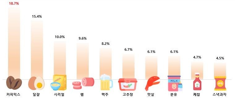 가격 상승률이 가장 높은 품목은 '커피믹스'로 18.7% 올랐다. 이어 달걀(15.4%), 시리얼(10.0%), 햄(9.6%), 맥주(8.2%) 순으로 상승률 상위 품목을 이뤘다. 이들 5개 품목의 평균 상승률은 12.4%로 전체 평균 대비 3배 이상 높은 상승률을 보였다.