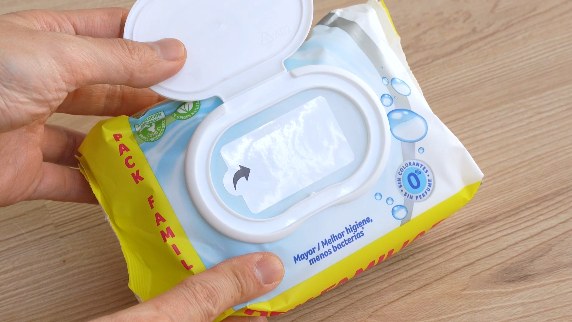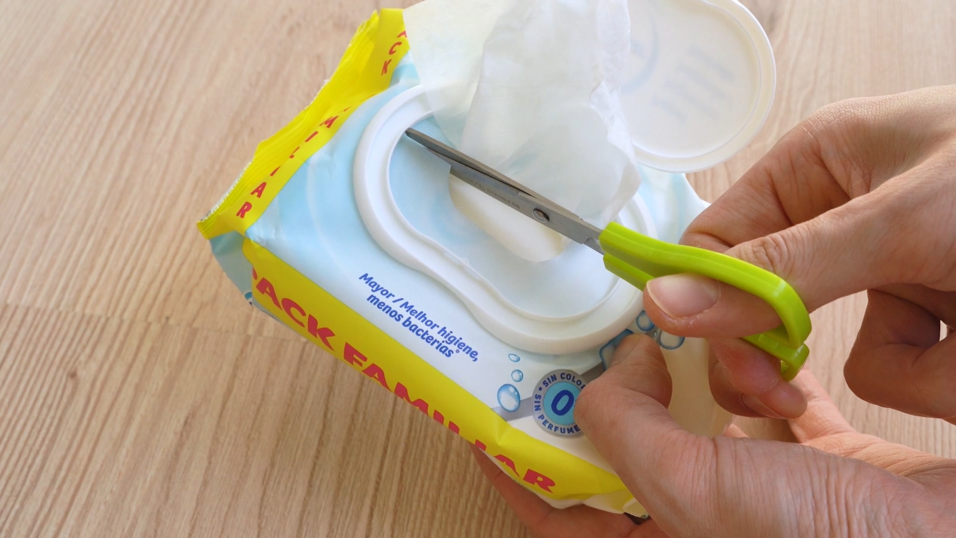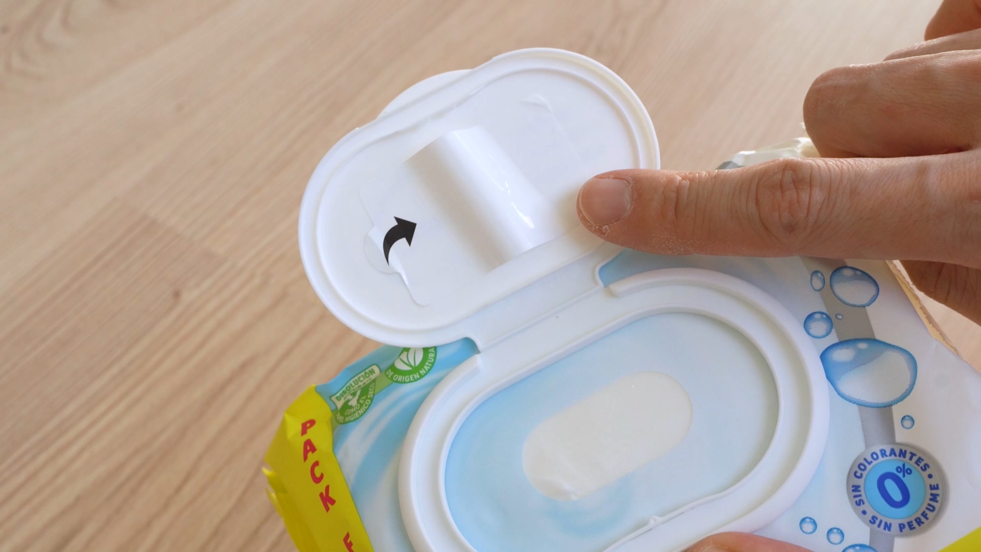 새 물티슈를 뜯어 보면 항상 스티커가 입구를 막고 있어요. 여기에 보통 안내 문구로 스티커를 떼어 버리라고 적혀 있는데요. 이제는 절대로 스티커를 떼서 버리지 마세요. 이것을 떼어 버리면 티슈가 마르게 되는 원인이 될 수 있어요.