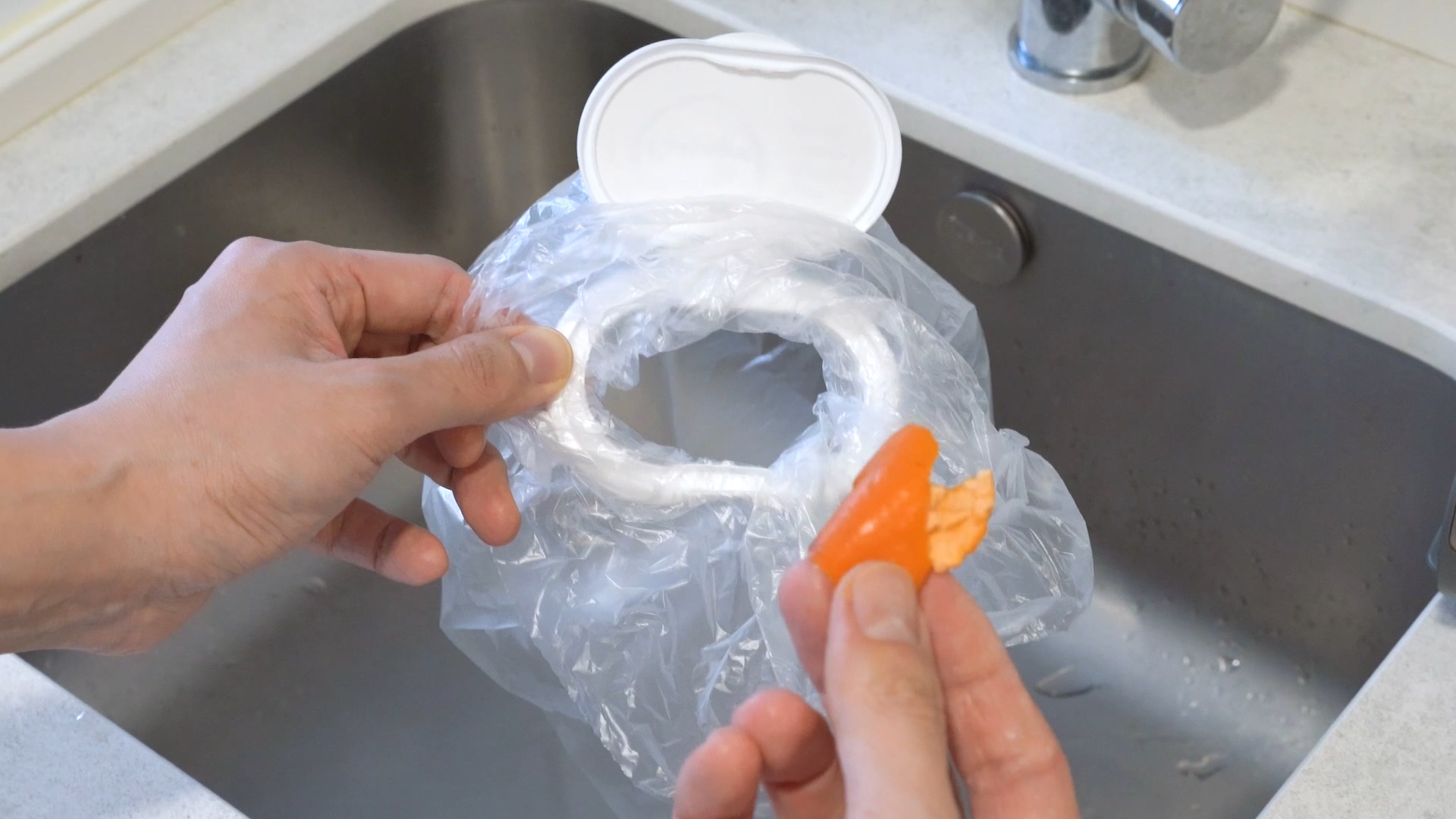 떼어낸 뚜껑에 음식물 쓰레기 봉지를 담아 주세요. 그리고 음식물 쓰레기를 담아 두고 뚜껑을 닫아 놓으면 날파리도 꼬이지 않고 냄새도 나지 않아 아주 유용하게 활용할 수 있답니다.