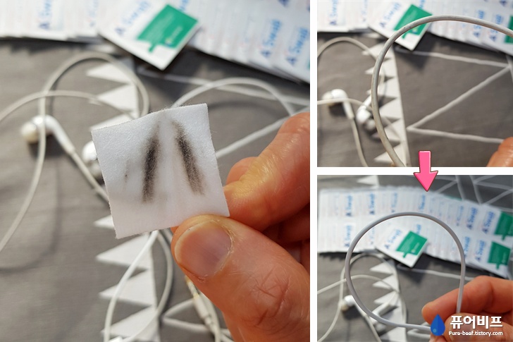 한번 닦았을 뿐인데 더러워 진 것이 보이시나요 …? 대신 이어폰은 엄청 하얗게 변했어요 ㅋ 원래 저색이 맞았나 싶네요.