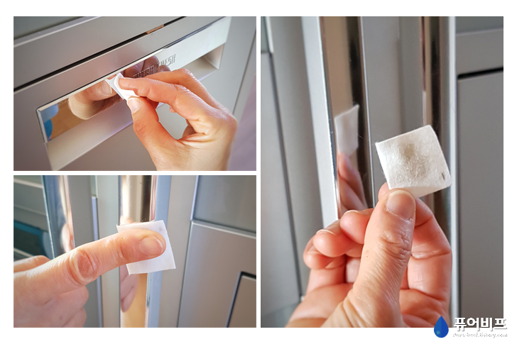 냉장고 문이에요. 냉장고 문도 마찬가지로 손이 많이 가는 곳인데요. 그래서 닦고 났을 때 더러움이 많이 뭍어 났어요 : (