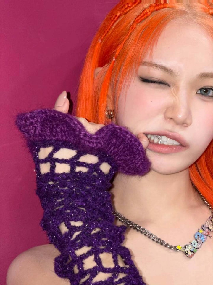 이날 공개된 사진에서 김채원은 형광 오렌지빛의 헤어 컬러와 함께 비비드 옐로우 컬러의 나시톱, 체크 패턴 스커트, 그리고 그물 가디건으로 완성한 Y2K 스타일을 선보였다.