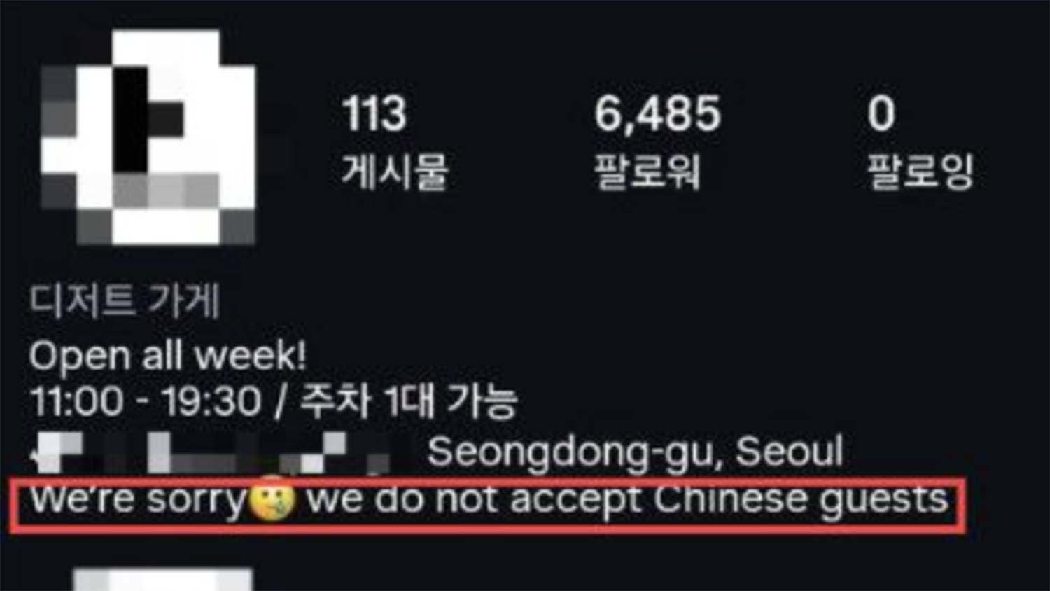 한국에서 9년째 살고 있다는 중국인 A씨는 자신의 SNS에 "친구와 함께 카페에 갔는데, 사장이 '우리는 중국인을 받지 않는다'며 나가게 했다"며 "한국에서 살면서 이런 말은 처음 들었다"고 밝혔다. A씨는 "사장이 어떤 일을 겪었는지 모르겠지만, 특정 국가를 겨냥해 무시하는 행위라고 확신한다"며 "2025년에 한국 서울에서 이런 일이 있을 수 있다니 정말 유감이다"라고 지적했다.