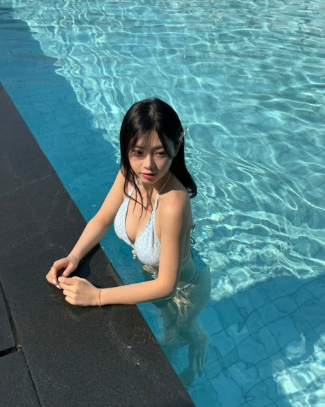 하늘색·화이트 계열 수영복이 정말 잘 어울릴 거예요.