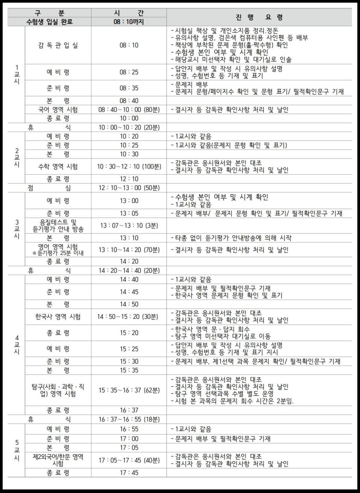 이번에 수능을 치르는 일반 수험생 시험은 오전 8시 10분까지 모든 수험생이 입실을 완료해야 시작된다. 1교시는 국어 영역으로, 오전 8시 40분에 시작해 10시까지 80분간 치러진다. 시험 전에는 감독관이 유의사항을 안내하고, 수험생은 답안지에 성명과 수험번호를 기재한 뒤 문제지 문형과 페이지 수를 확인하고 필적확인문구를 적는다. 시험이 끝난 뒤에는 20분간 휴식 시간이 주어진다.
