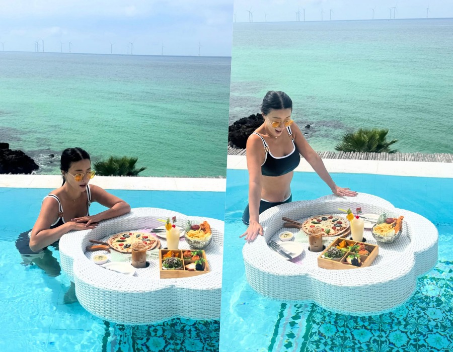 특히 물 위에 띄운 플로팅 테이블 위엔 피자, 샐러드, 감튀, 음료까지 풀 세팅된 브런치가 놓여 있어 시선을 사로잡는다. 황보는 자연스러운 표정과 포즈로 '힐링, 럭셔리'가 섞인 완벽한 휴가 컷을 완성했다.