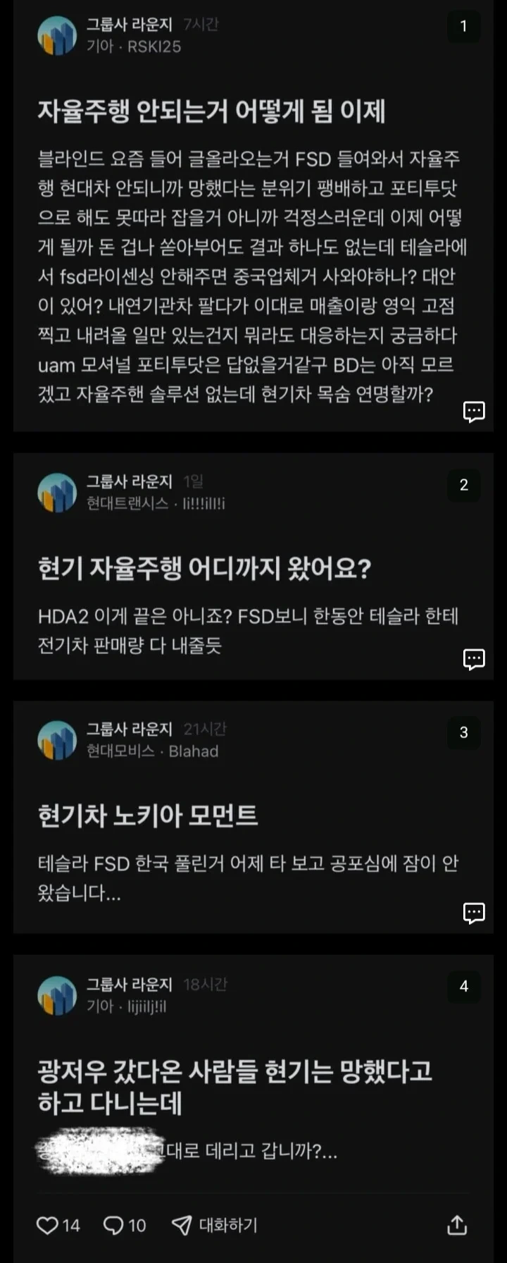 테슬라 FSD관련 현대차 계열사 직원들 반응