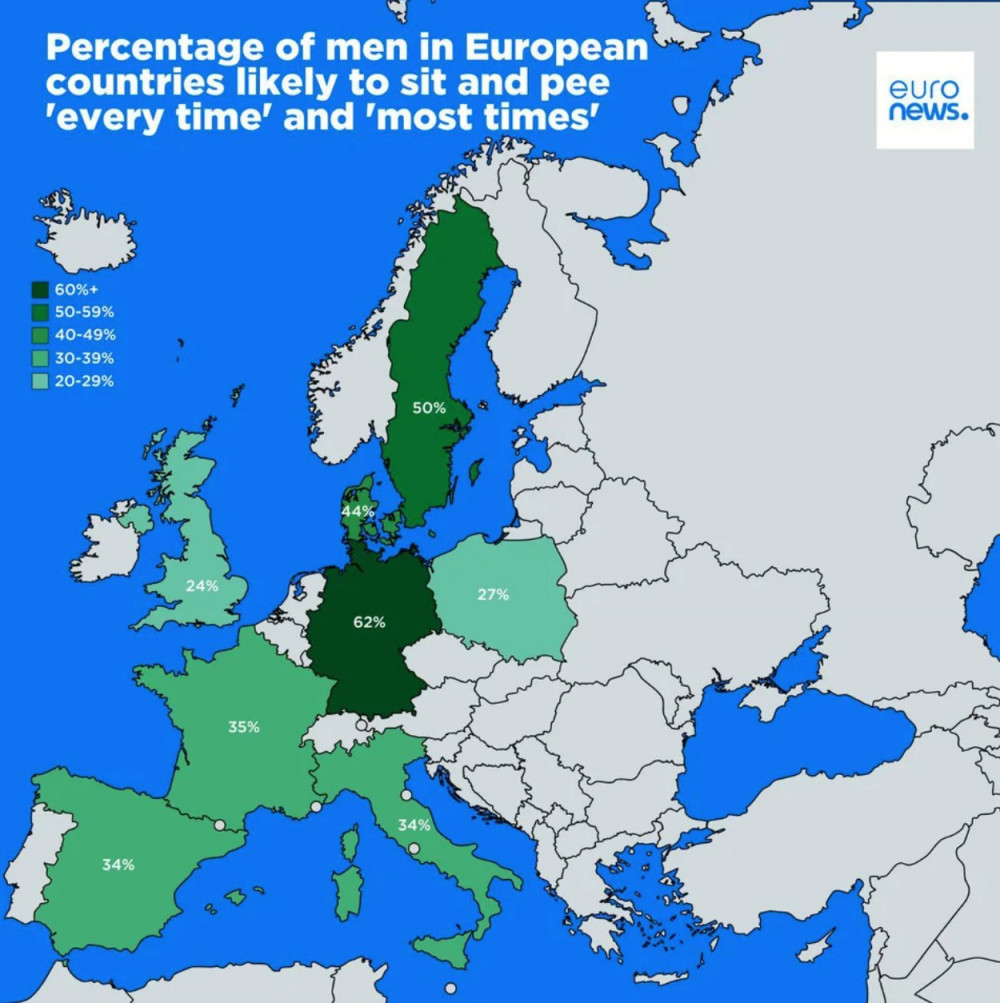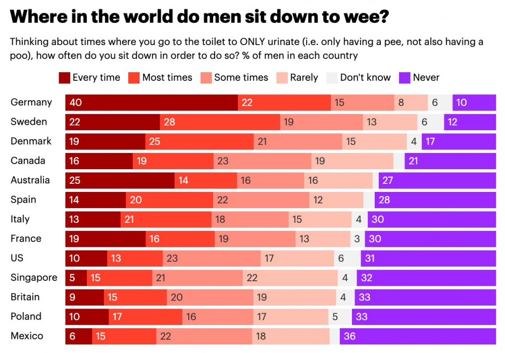 조사에 따르면, 독일 남성의 40%가 항상, 22%가 대부분 앉아서 소변을 본다고 답해 약 ⅔가 앉아서 소변을 보는 사람들이라고 한다.