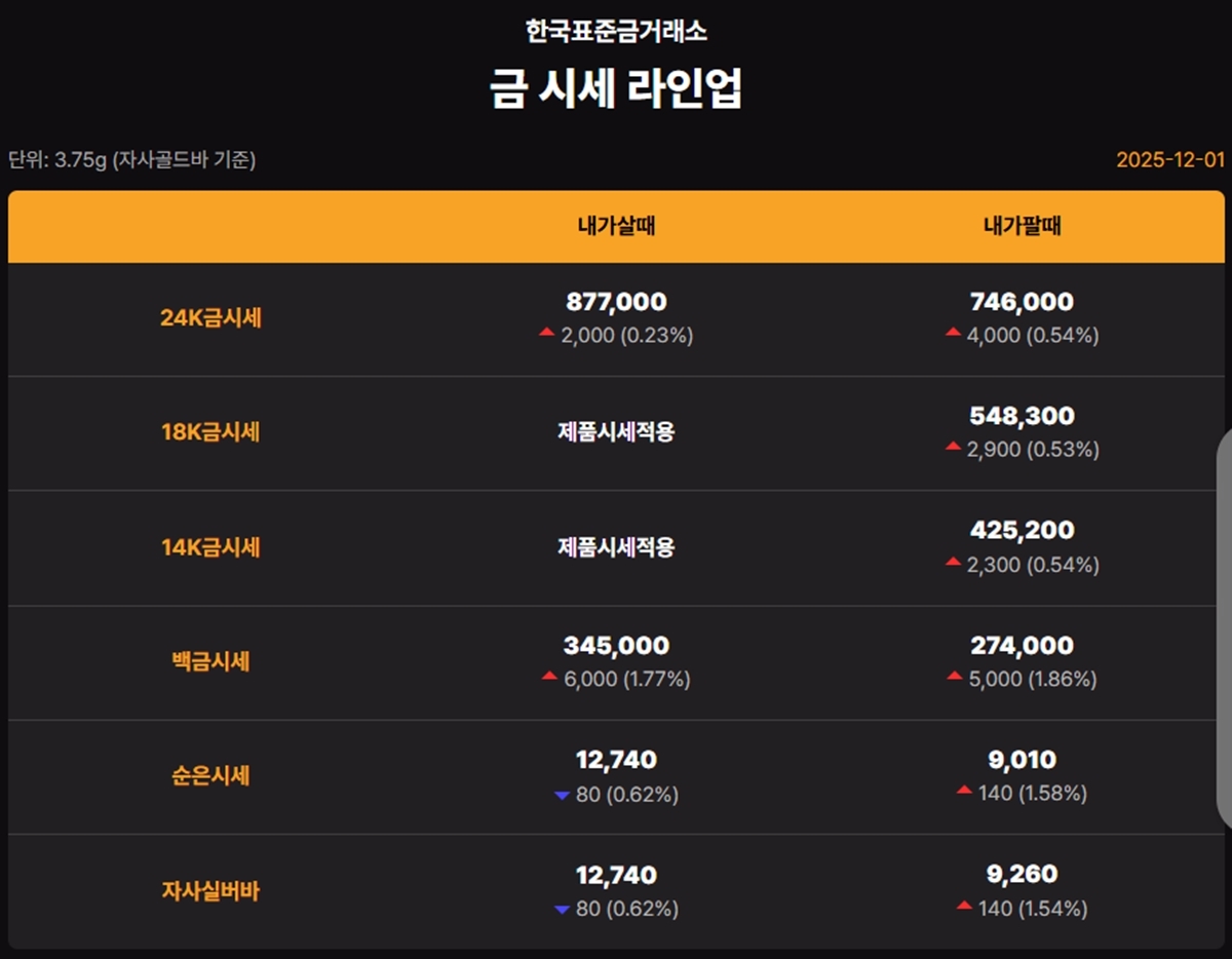 국내 금시세(금값)가 1일(한국 시각) 오후 상승세(전 거래일 대비)를 보이고 있다.