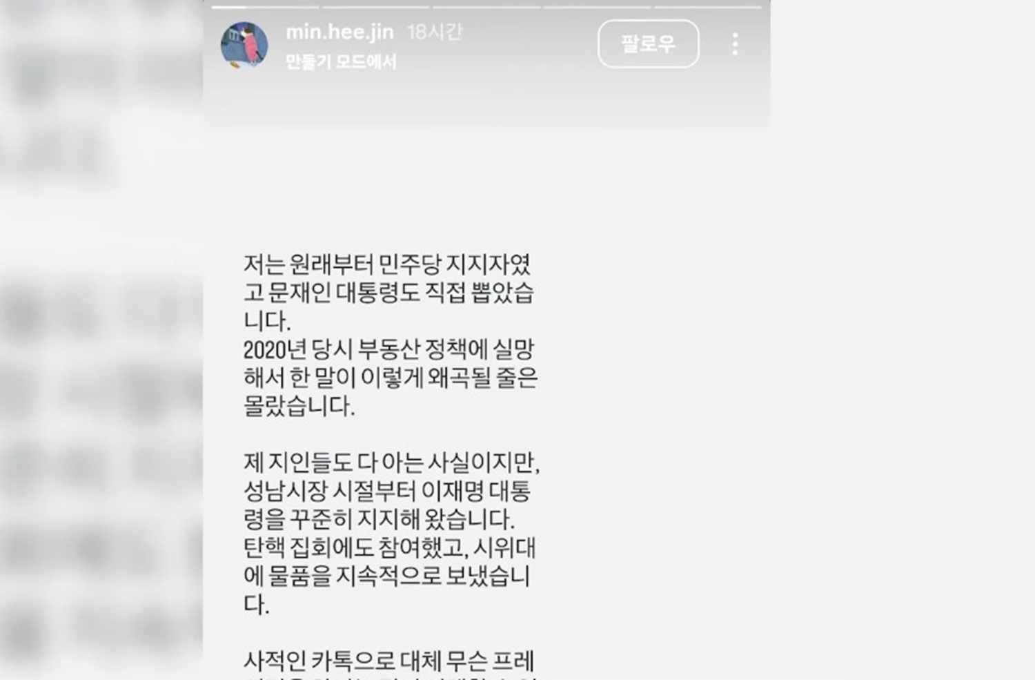 지난 28일, 민 전 대표는 자신의 SNS를 통해 논란이 된 발언에 대한 입장을 공개했다. 전 대표는 “저는 원래부터 민주당을 지지해왔고, 문재인 전 대통령에게도 투표했다”고 밝히며, 해당 발언이 나온 시점인 2020년 당시 문재인 정부의 부동산 정책에 대한 실망감을 표현한 것이 와전된 것이라고 설명했다.