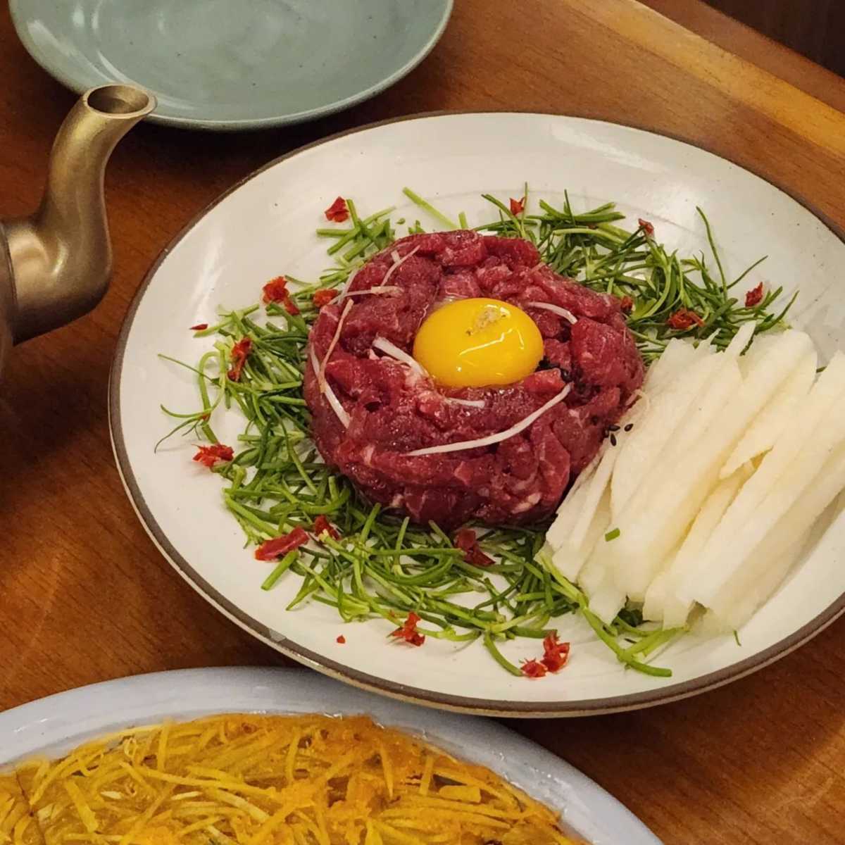 한우 육회 26,000원 신동 생 막걸리 10,000원 악양 생 막걸리 10,000원