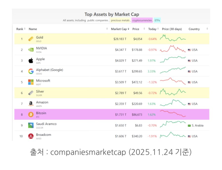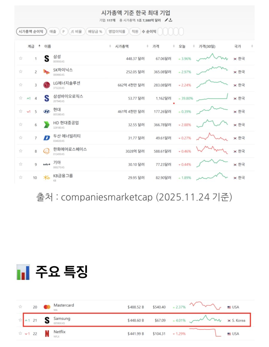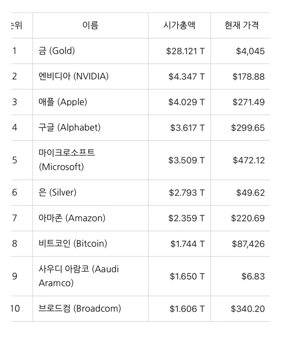 1위는 다들 아시다시피 금 gold 2위 엔비디아 기업으로는 전세계 1위 3위 애플 단 11월말 지표이고, 현재 엔비디아와 애플의 시총 간극은 1700억달러로 급격히 좁혀짐. 애플의 상승세가 꾸준하며 가파르고 흐름이 애플이 다시 1위 먹는 흐름 삼성은 넷플 제치고 21위 전 지구를 아우르는 건 전부 it기업이 장악하네요 2만 명이 산다는 중국 아파트 내부최근 서울에 나타난 외래종한국 좋아하고 K-POP 만화 그리는 일본 만화가 실수그 시절.. 드래곤볼 보면서 충격먹었던 장면10년 전 사라졌던 마트 점원