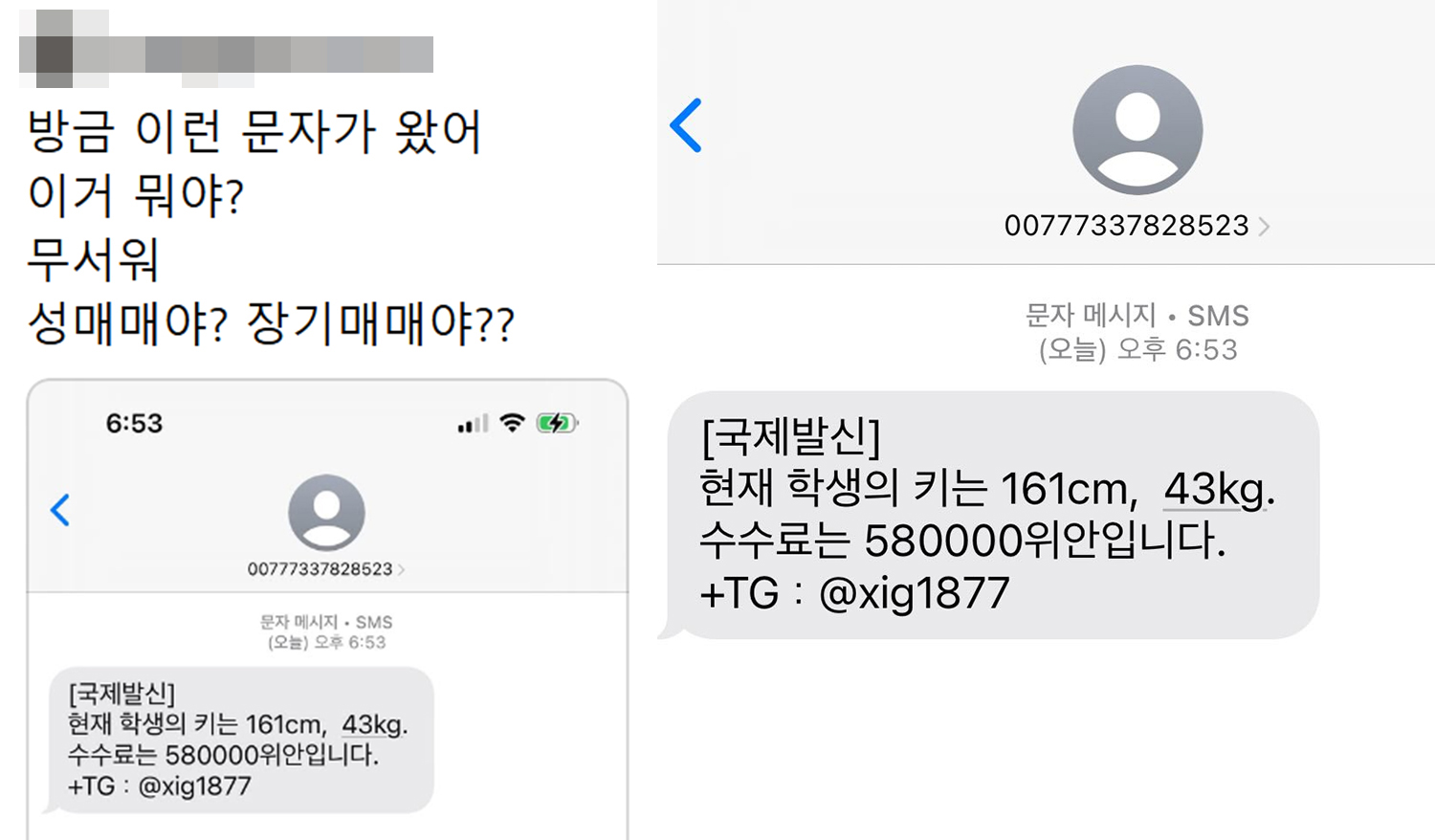 소셜 미디어 플랫폼 스레드(Threads)에 정체불명의 문자를 받았다는 내용의 게시물이 올라와 누리꾼들 사이에서 불법 ‘장기 매매’ 의혹이 급속도로 확산되고 있다. 해당 문자는 충격적이게도 ‘학생 키’라는 표현과 함께 ‘161cm’, ’43kg’ 등 구체적인 신체 정보, 그리고 ‘수수료 58만 위안’이라는 거액의 조건 및 특정 ‘TG 아이디’를 담고 있었다.