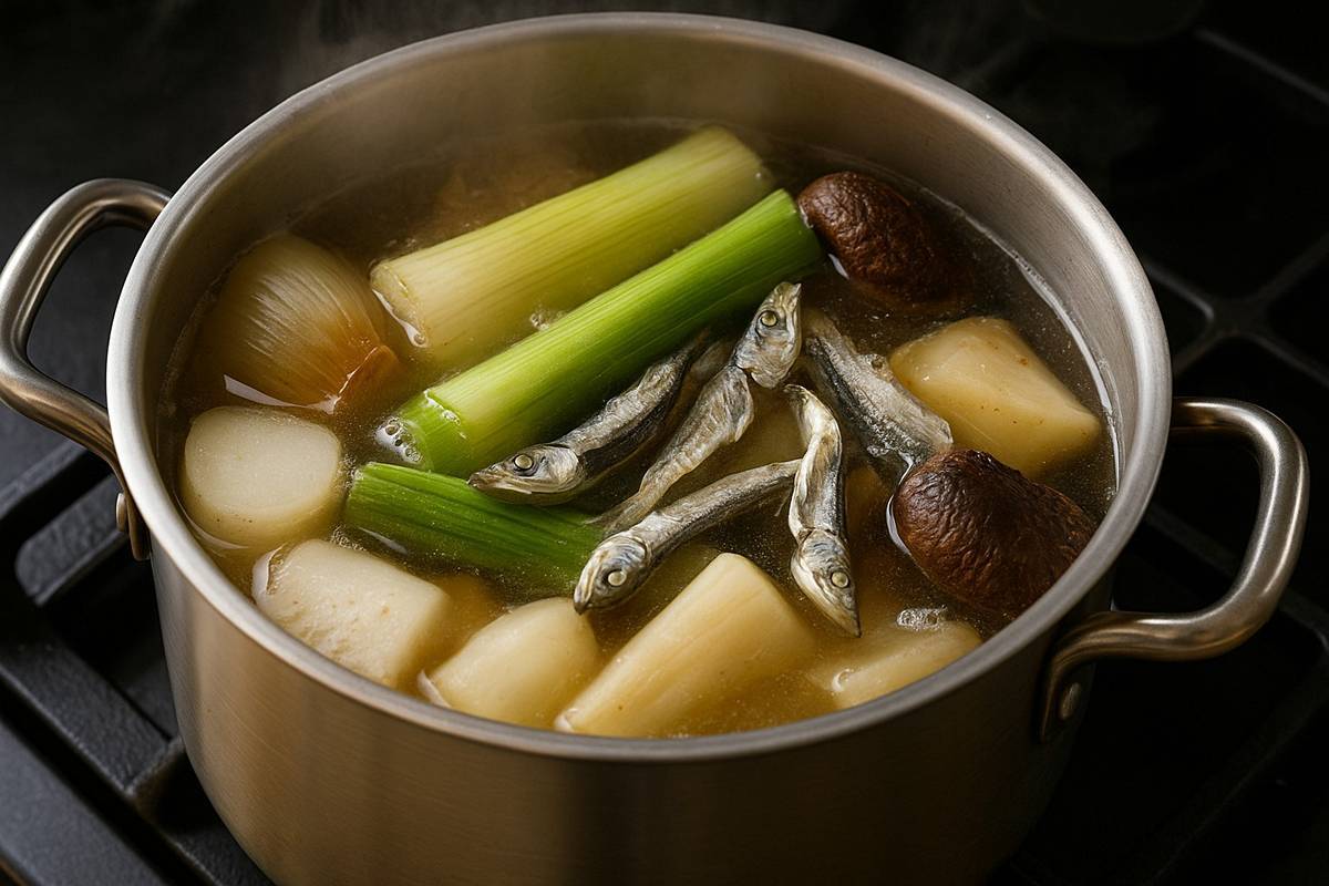 육수를 만들 때는 다음 순서가 가장 이상적이다. 다시마를 제외한 대파, 파뿌리, 무, 멸치 또는 디포리, 건표고, 양파 등을 강불에 10분 끓인다. 중불로 줄여 15분 더 끓이며 천일염 한 큰술을 넣는다. 마지막에 다시마를 넣고 딱 5분만 더 끓인다. 오래 끓이면 텁텁해지므로 반드시 5분을 지켜야 한다.