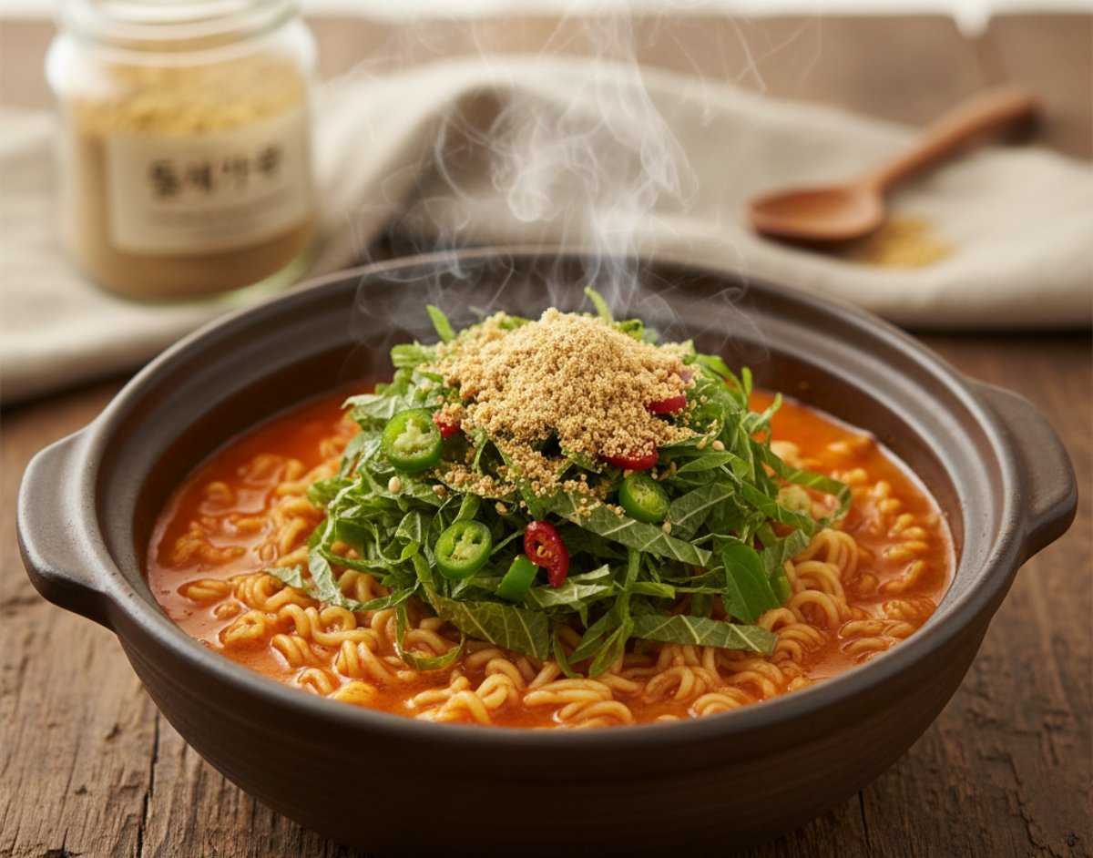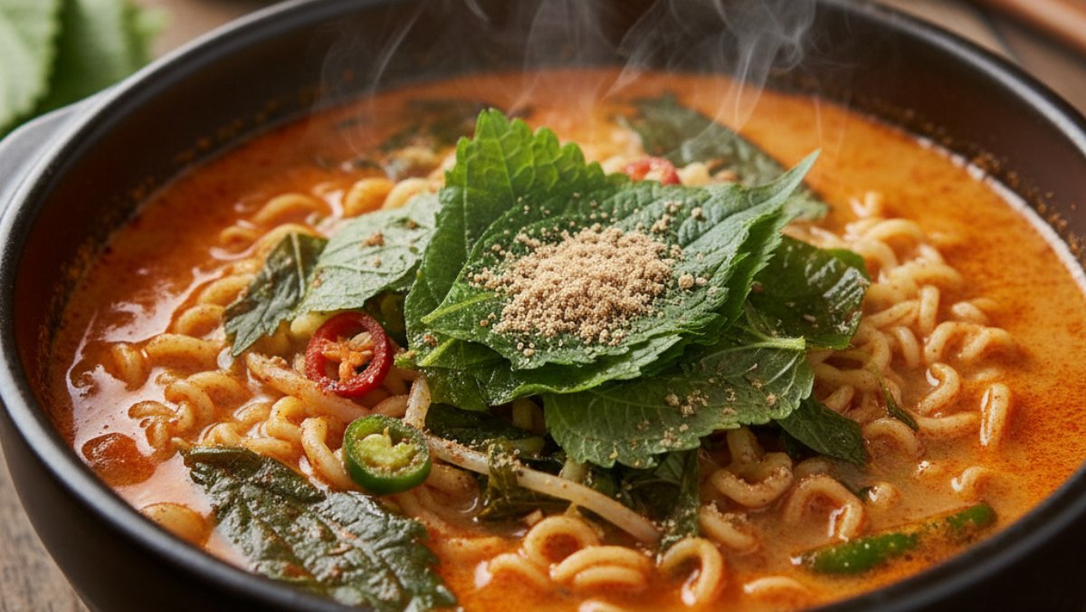물이 끓으면 라면 스프와 면을 넣고 일반적인 방식으로 끓이되, 다진 마늘을 이때 함께 넣어준다. 면이 2/3 정도 익었을 때 들깨가루를 넣는다. 불을 약간 줄인 상태에서 들깨가루를 잘 풀어주면 끓어 넘침도 막고 국물에 들깨의 고소한 풍미를 잘 스며들게 할 수 있다. 면이 거의 익고 불을 끄기 직전, 준비한 깻잎과 청양고추를 넣는다. 깻잎은 오래 끓이면 향이 날아가기 때문에 잔열로 살짝만 익히는 것이 핵심이다.