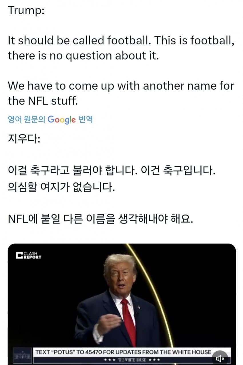 트럼프 대통령은 "미국에서 축구에 무슨 일이 일어났는지 살펴보면, 미국에서 축구는 Soccer인데, 우리는 그것을 FootBall이라고 부르지 않는 것 같습니다.
