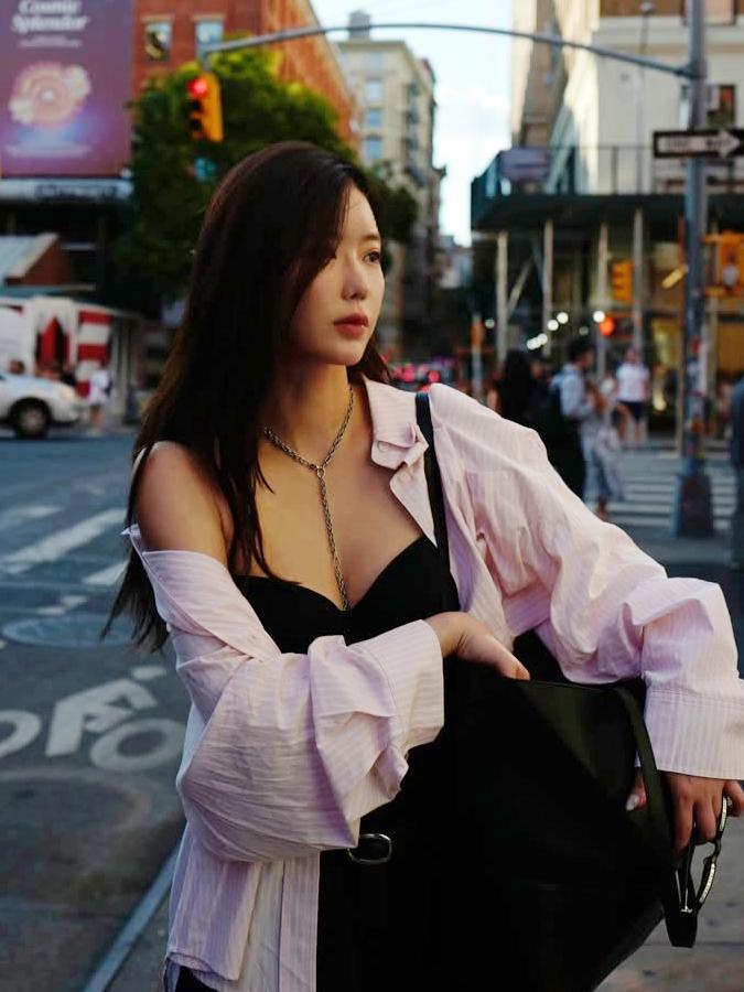 특히, 블랙 컬러의 이너웨어 위에 핑크빛 오버사이즈 셔츠를 걸쳐 산뜻하면서도 시크한 분위기를 연출했다. 여기에 얇은 체인 목걸이를 매치해 미니멀한 포인트를 더했고, 도회적인 쿨함을 배가시켰다.