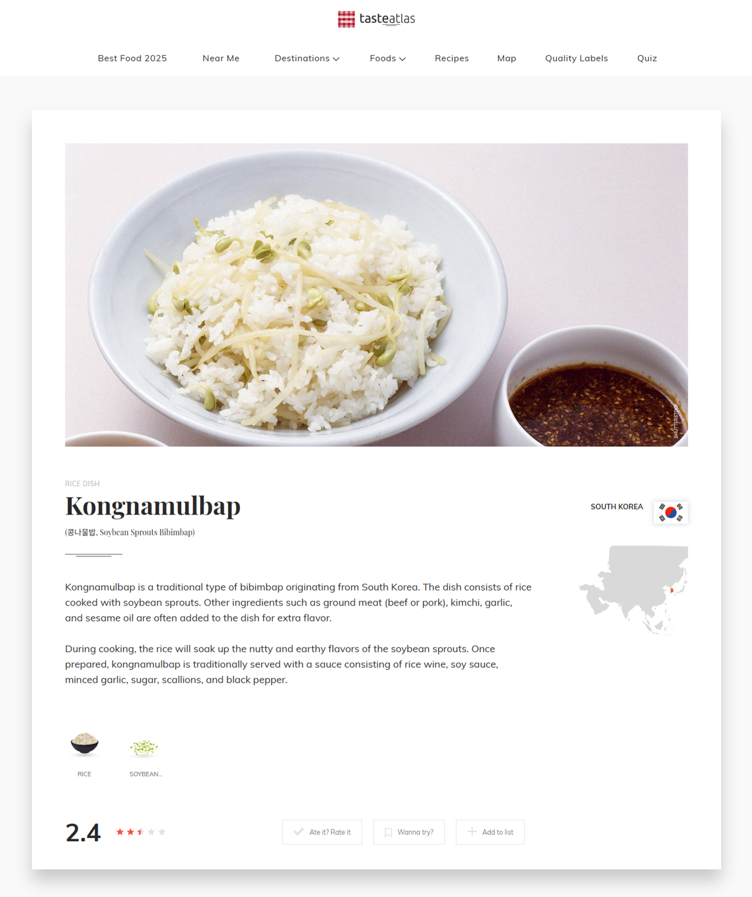 콩나물을 함께 넣어 만든 한국의 전통 밥인 콩나물밥 역시 냄새가 다소 비릴 수 있으나, 간장을 풀어 먹는 등 한국 고유의 취식 방식을 고려하지 않은 일방적인 평가라는 지적이다.