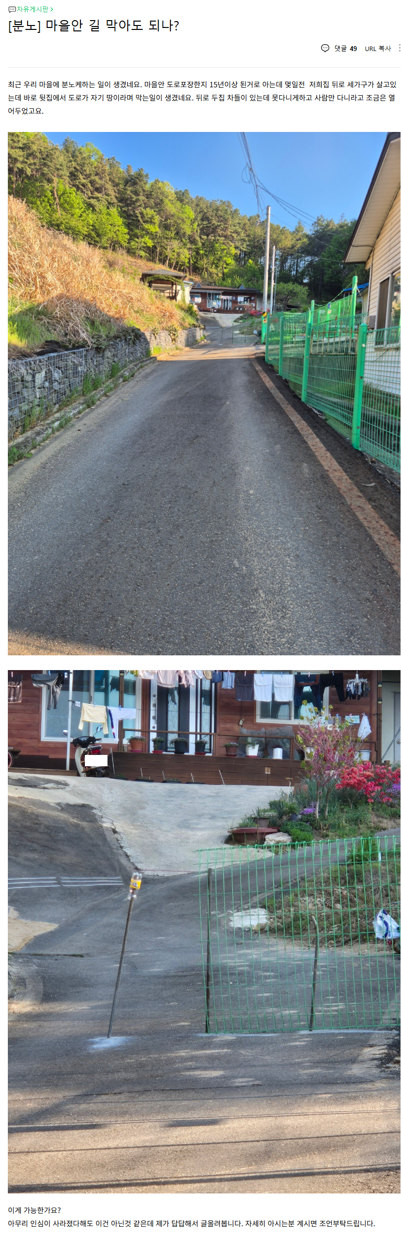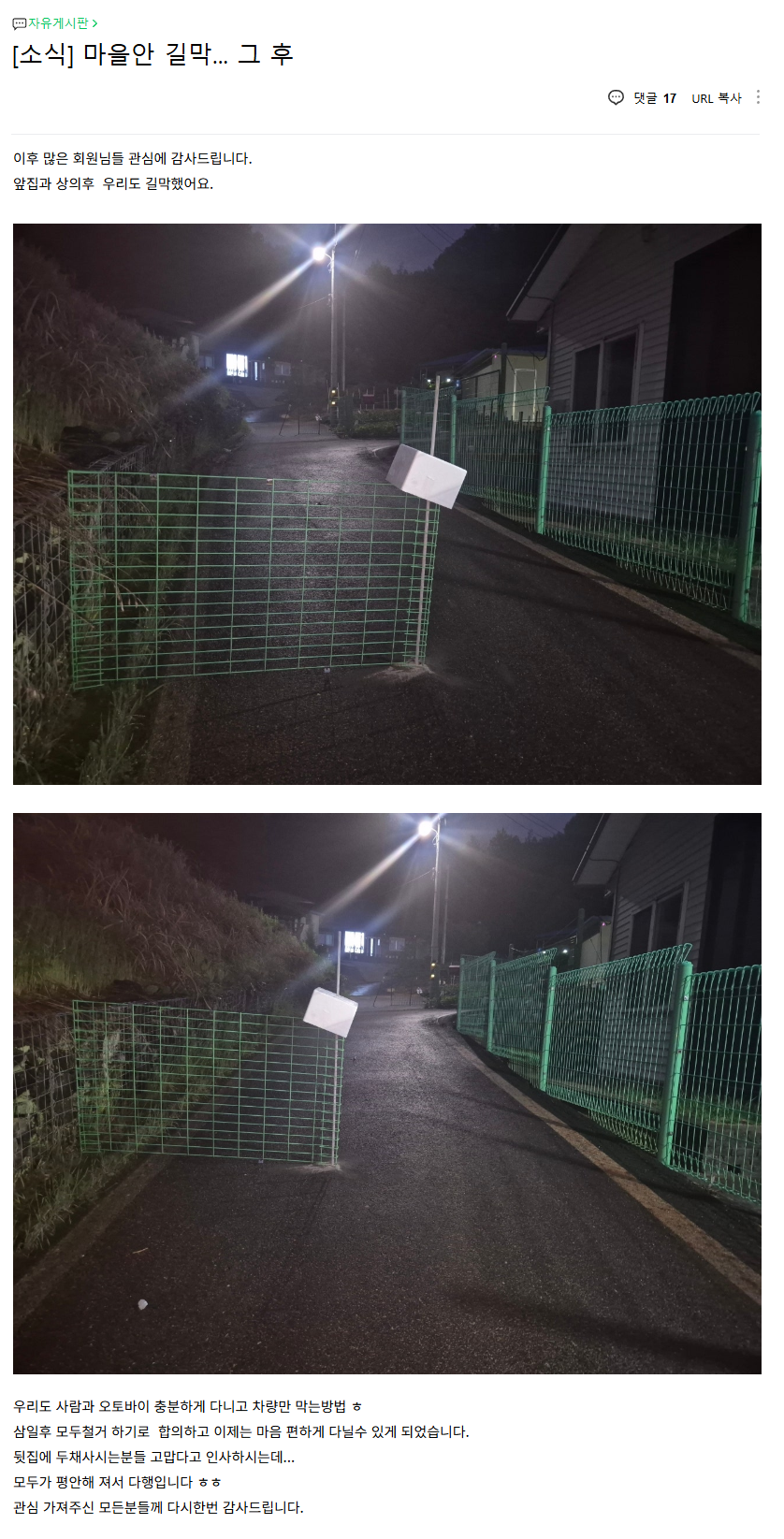 7일 후 요약 글쓴이는 앞집에 살아서 길 막은거랑 상관이 없었음 길막 집 뒤에 두 집이 사는데 중간에 있는 집이 내 땅이라며 길막 시전 7일 후 글쓴이도 길막 당한 두 집을 도와줄려고 길막 앞 길막을 시전 최초 길막 집이 GG를 외치며 해피엔딩으로 끝남 이런 중소기업은 퇴사하면 안됨1년동안 술만 마시다가 재미로 수능 본 의대생 수능 결과휴머노이드 로봇에게 숨겨진 더 효율적인 이동 방식목수 입문 한달차에 그만두게 된 디시인한양대 27년부터 무제한 전공