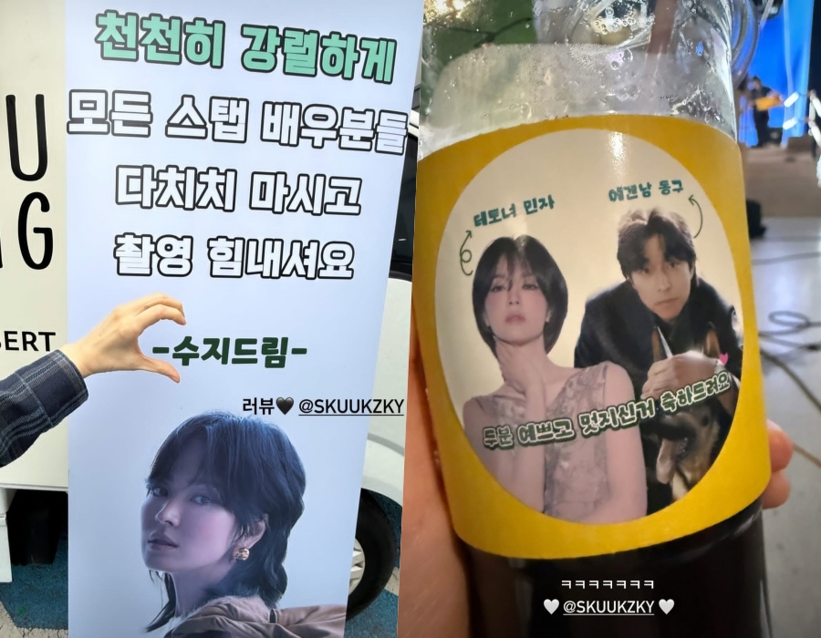 사진 속에는 '지니야 혜교언니를 응원합니다', '덤으로 깨비오빠도 응원합니다'라는 글과 함께 수지가 태그되어 있다. 이어 '수지드림'이라는 문구가 담긴 현수막에는 "천천히 강렬하게 모든 스탭 배우분들 다치지 마시고 촬영 힘내셔요"라는 글과 함께 손하트를 보내고 있는 송혜교의 모습이 담겨있어 훈훈함이 더해진다.