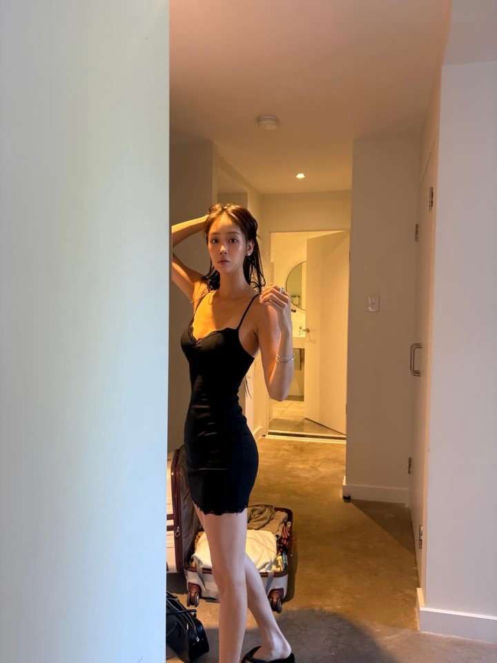 특히, 다리를 꼬고 앉은 포즈에서는 슬림한 각선미가 눈에 띄었으며, 베이지 컬러의 부츠 샌들로 포인트를 더하며 세련된 패션 감각을 드러냈다.