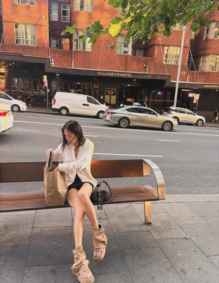 사진 속에서 소유는 호주 거리로 추정되는 장소에서 벤치에 앉아 휴식을 취하거나 잡지를 읽으면서 자연스러운 분위기를 연출했다.