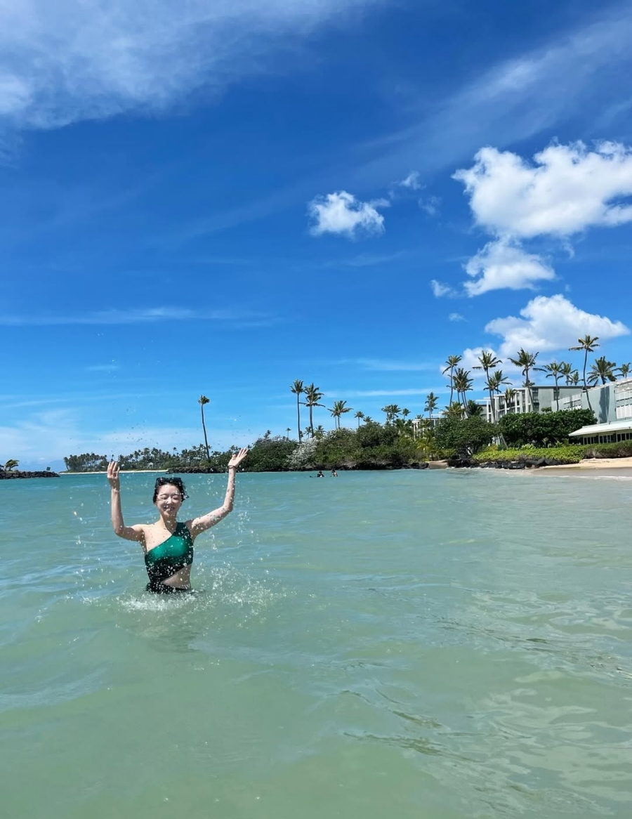공개된 사진 속 조우리는 에메랄드빛 바다에서 두 팔을 들어 올린 채 물장구를 치며 휴가의 해방감을 만끽한다. 군더더기 없는 원숄더 수영복 차림은 조우리 특유의 청순한 분위기를 살렸고, 청량한 하늘과 야자수가 어우러진 풍경이 여름의 온도를 끌어올린다.