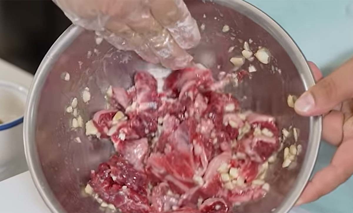 양념장 제조 과정은 매우 간단하다. 갈빗살 200g을 기준으로 연두 2큰술을 넣는다. 단맛을 내는 설탕 등은 연두의 절반만 넣는다. 후추는 두 번 정도 뿌린다. 고기 자체의 풍미를 살리기 위해 참기름은 반 큰술만 사용한다. 마지막으로 마늘을 세 숟가락 넉넉하게 넣어 마늘 베이스의 양념장을 완성한다.