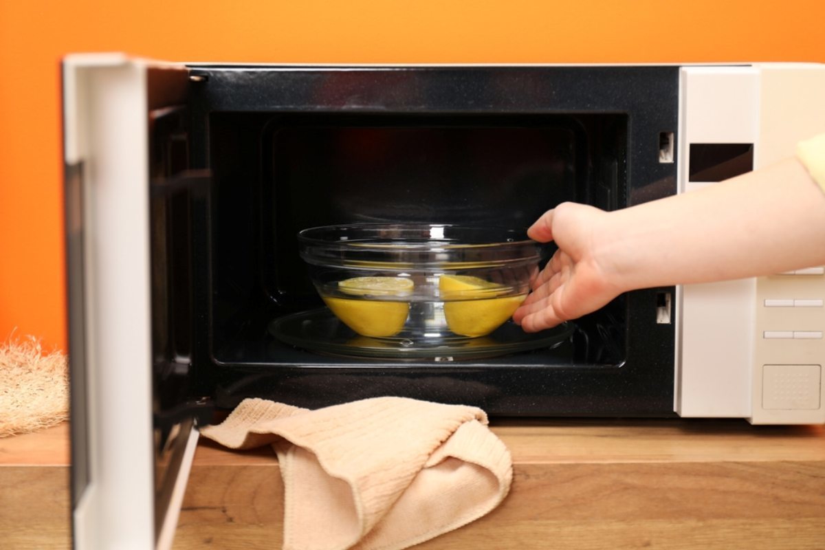 내열 그릇에 물과 식초(또는 레몬 조각)를 넣고 전자레인지 안에 넣는다.