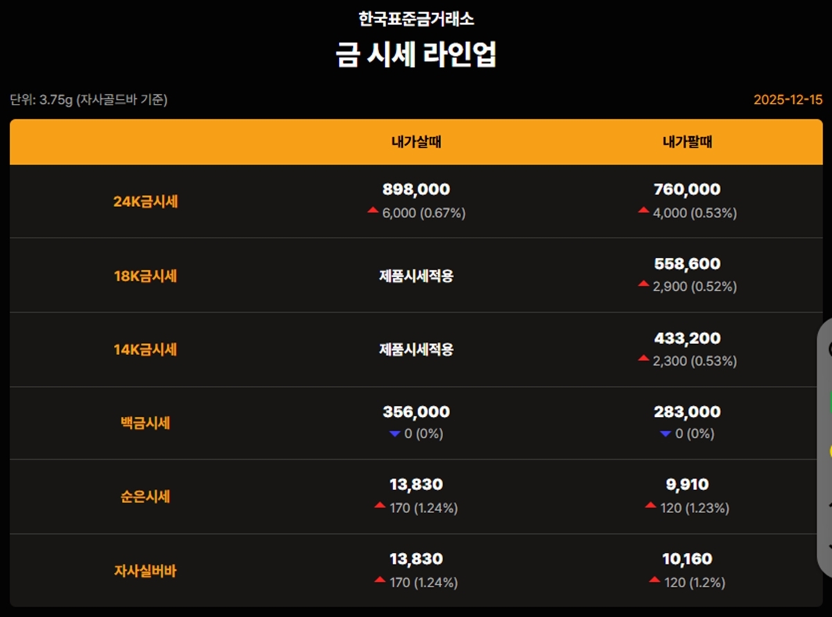 국내 금시세(금값)가 15일(한국 시각) 오후 상승세(전 거래일 대비)를 보이고 있다.