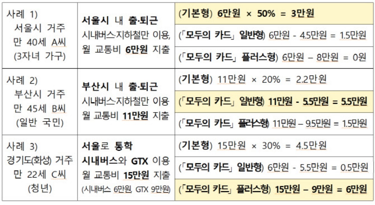 '모두의 카드'는 이용하는 교통수단의 요금 단가에 따라 '일반형'과 '플러스형'으로 구분된다. '일반형'은 시내버스나 지하철 등 1회 이용 요금이 3000원 미만인 교통수단 이용액에 대해 적용된다. 반면 '플러스형'은 GTX(수도권광역급행철도)나 광역버스 등 1회 요금이 3000원 이상인 고비용 교통수단을 포함한 모든 대중교통 이용액에 적용된다. 이는 GTX 개통 등으로 인해 교통 편의성은 높아졌으나 교통비 부담이 급증한 장거리 출퇴근족을 겨냥한 것이다.