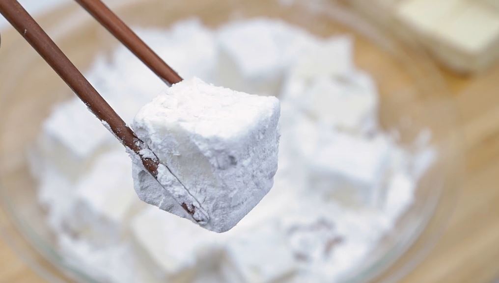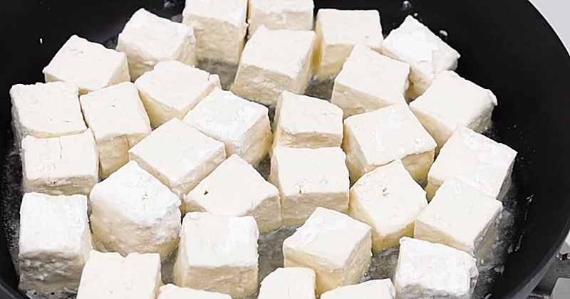 썬 두부는 바로 팬으로 가지 않는다. 접시에 펼쳐 5~10분 정도 공기 중에 두어 표면의 수분을 날린다. 이 과정을 거치면 전분이 훨씬 잘 붙고, 팬에서도 튀지 않는다. 급하다고 생략하면 두부 표면에 남은 수분 때문에 전분이 뭉치고, 팬에서 서로 달라붙기 쉽다.