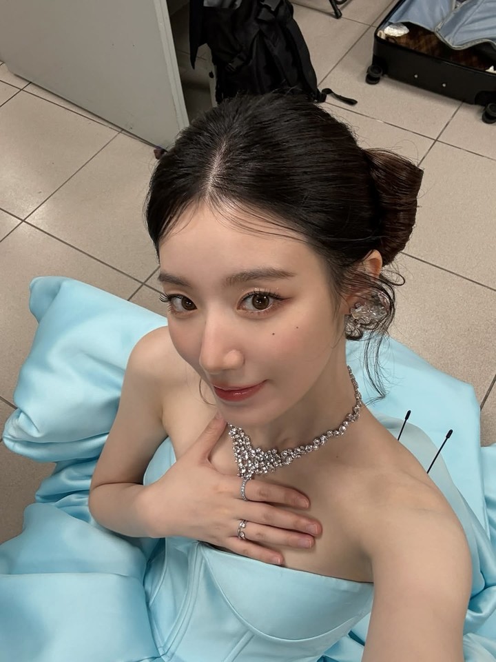 해당 사진에는 슈화가 하늘색 오프숄더 드레스를 착용하고 있는 모습이 담겼으며, 청초하면서도 세련된 분위기를 자아냈다.