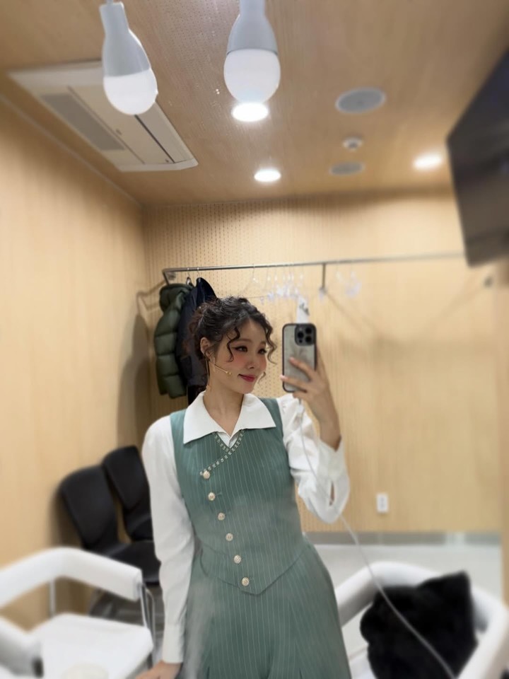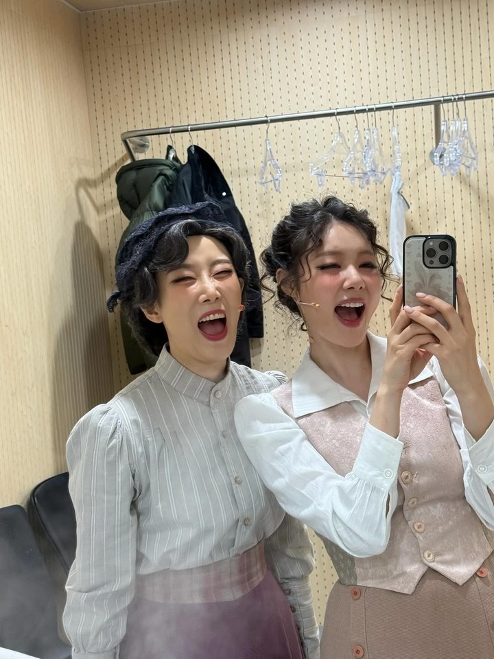 또 다른 컷에서는 뮤지컬 ‘레드북’에서 함께 호흡을 맞추는 배우와 함께 분장실에서 셀카를 남기는 모습도 눈에 띈다. 극 중 레트로 블라우스와 베스트, 웨이브가 더해진 컬리 헤어 스타일이 밝은 미소와 어우러져 무대 위 에너지와 상큼한 매력을 동시에 드러냈다.