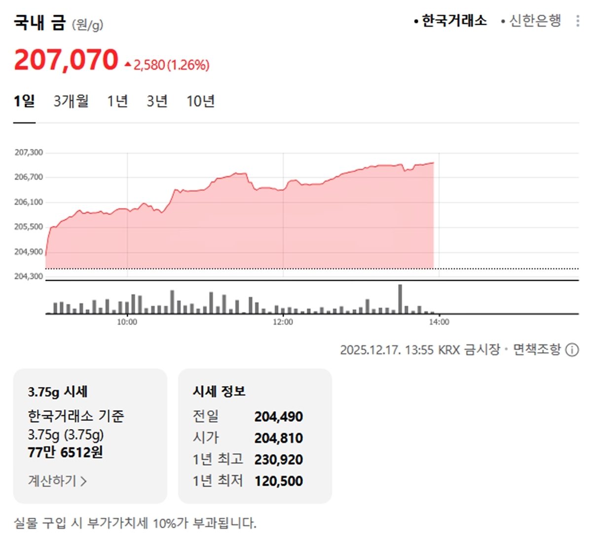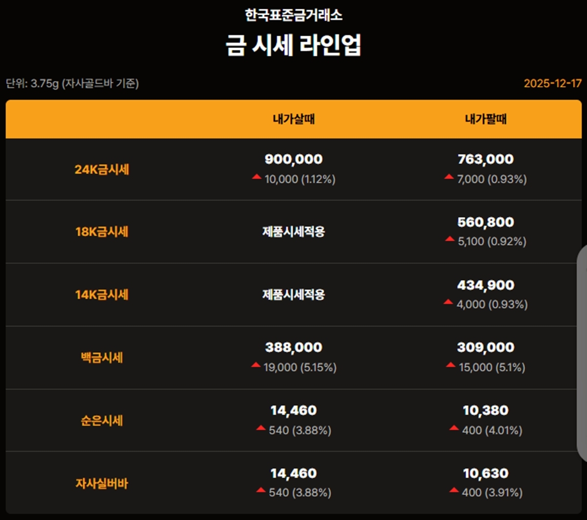 국내 금시세(금값)가 17일(한국 시각) 오후 폭등세(전 거래일 대비)를 보이고 있다.